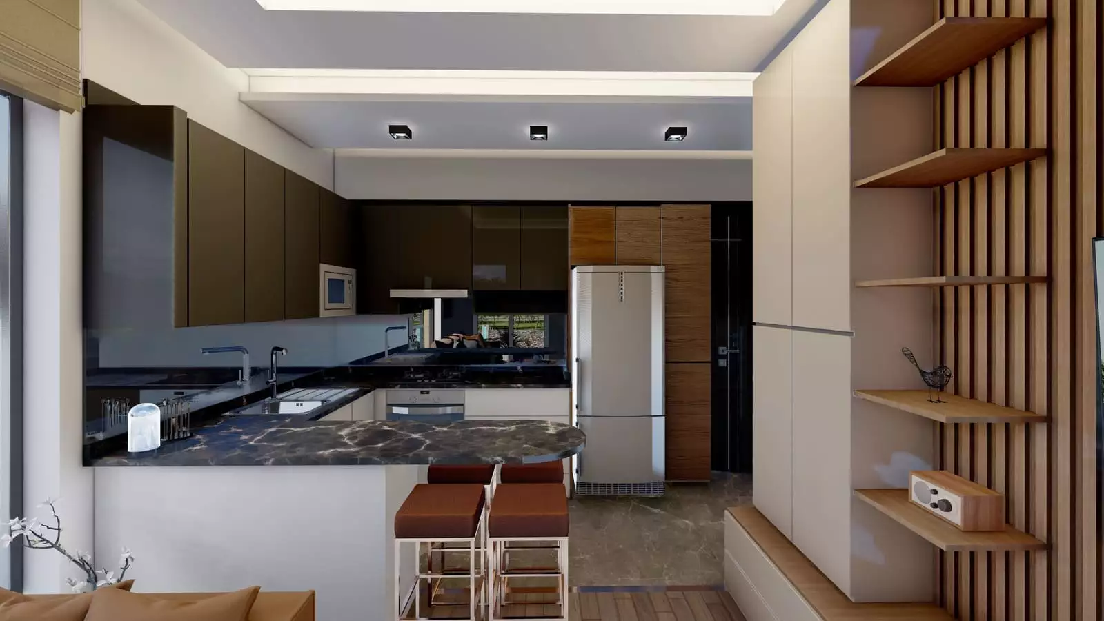 Внутри: Апартаменты предлагаются в стандартной чистовой отделке со встроенным кухонным гарнитуром и полностью укомплектованными санузлами.