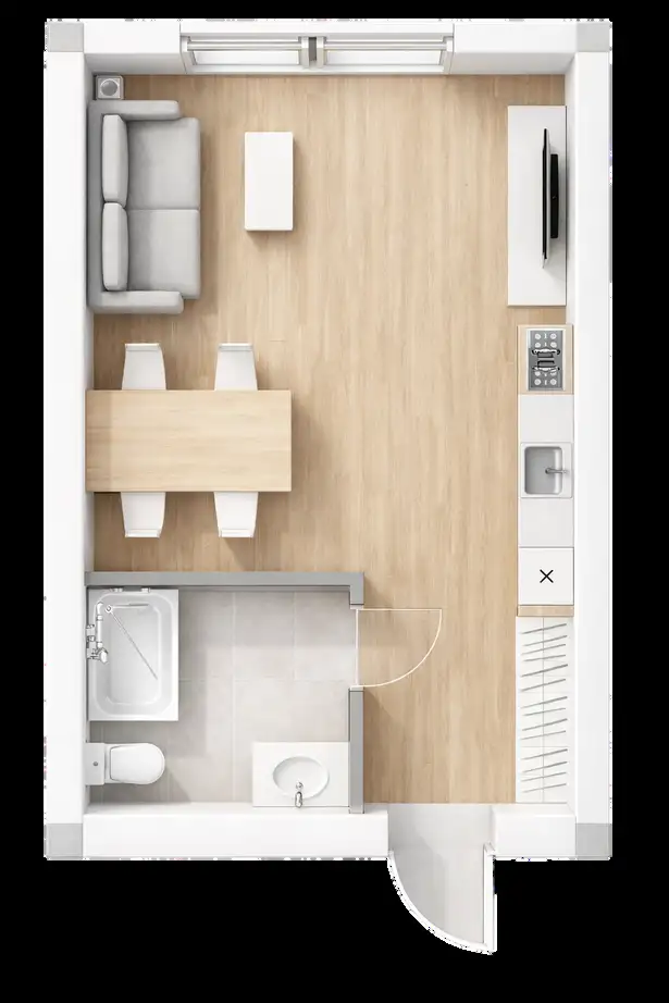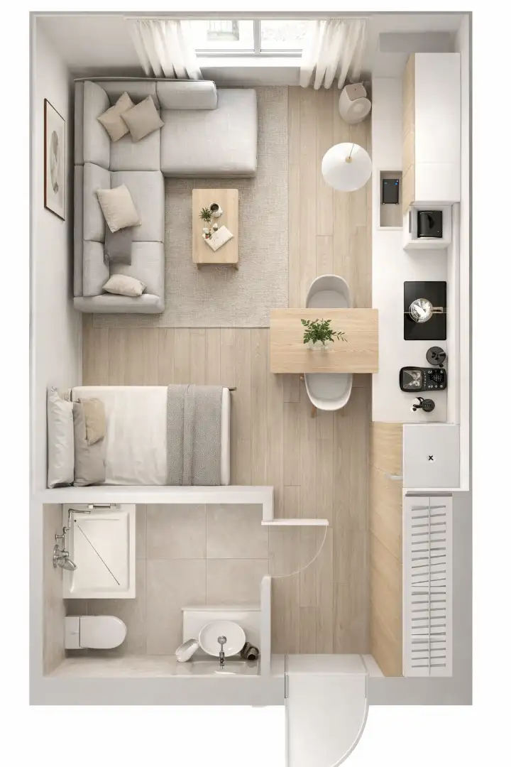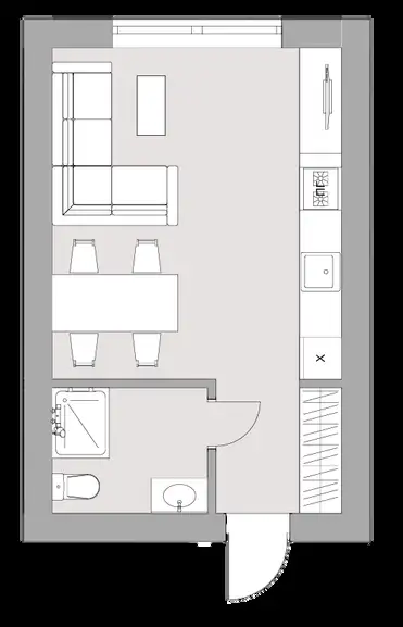 Продуманная планировка позволяет максимально эффективно использовать пространство: кухня, гостиная и обеденная зона объединены в одно светлое помещение.