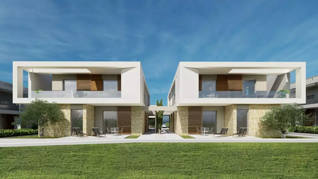 - Первый тип зданий - это апартаменты на первой линии. Всего в этом здании 6 квартир, из которых 2 квартиры с 1 спальней и 2 квартиры с 2 спальнями расположены на нулевом этаже и только 2 квартиры с 3 спальнями - на первом этаже (пентхаус) с собственной террасой на крыше. Особенностью данного типа является то, что каждая квартира имеет отдельный вход, даже квартиры на нулевом этаже. Таким образом, обеспечивается защита частной жизни.