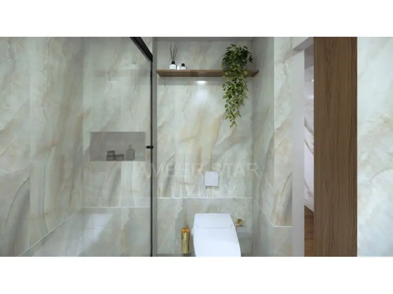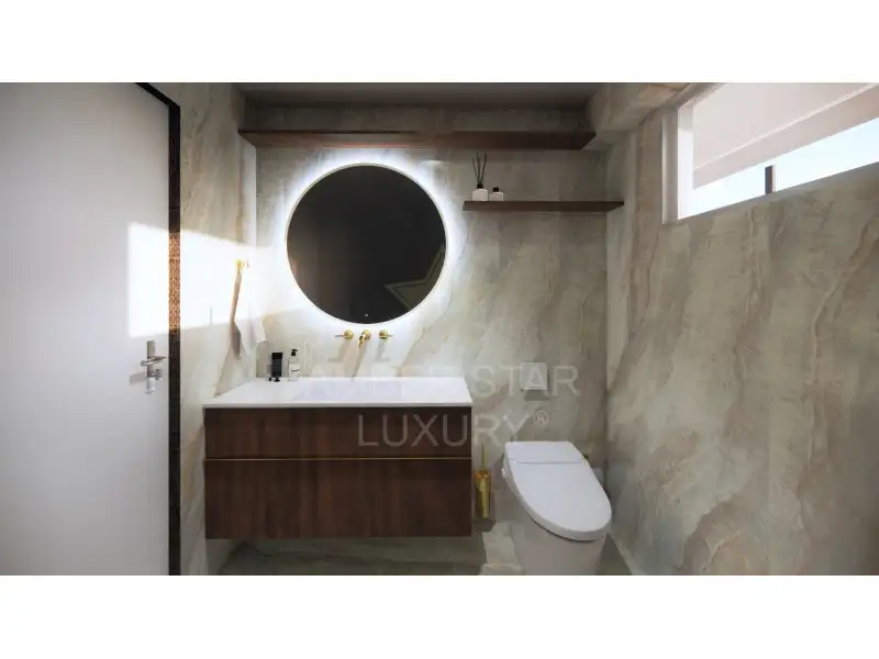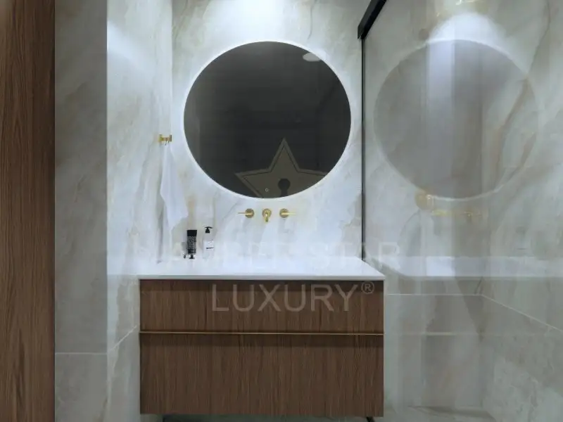 Сочетание дуба, золотых металлических деталей и камня Breccia Stone создаёт элегантное и функциональное пространство.