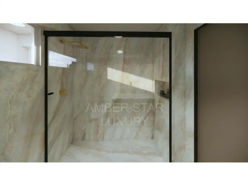 - Кухня высокого уровня с каменными столешницами Breccia Stone Beige, шкафами с золотыми ручками и верхними шкафами из рифлёного стекла;