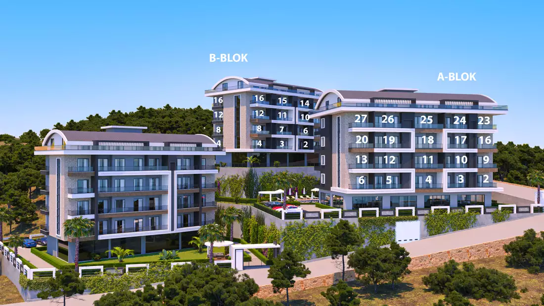 Все боковые квартиры имеют по два балкона. Расположение блоков комплекса открывает возможность для каждого жильца иметь вид на горы или море. Уже с нулевого этажа открывается прекрасный вид.