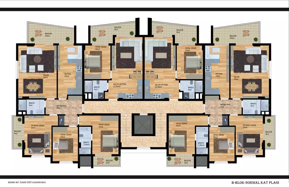 Общая территория комплекса занимает 4730 м², проект будет состоять из трех 5– этажных блоков которые включают в себя 96 апартаментов различных планировок, таких как: