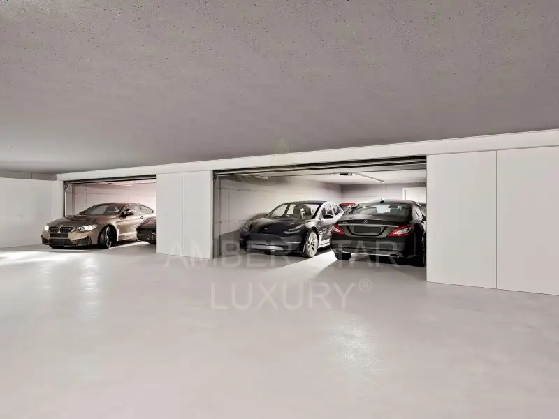 В доме есть частная парковка площадью 65 м², рассчитанная на 4 автомобиля, кладовая и частный лифт с прямым доступом в дом.