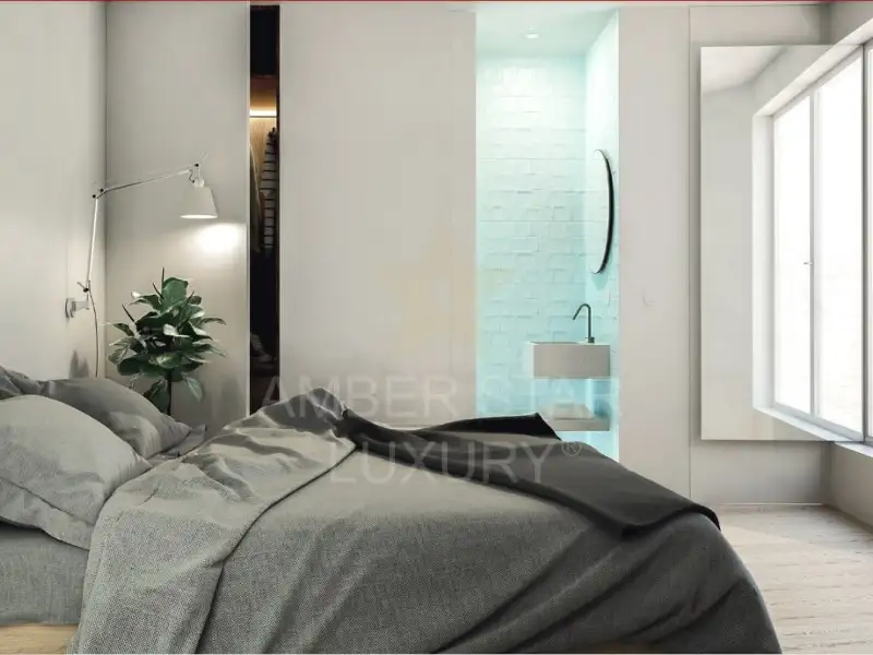 3. Ванная комната: Отделана качественной плиткой, пол из белого мрамора Estremoz и подвесная раковина из мрамора. Включает шкафы из морского ламината и металлические детали марки Bruma.