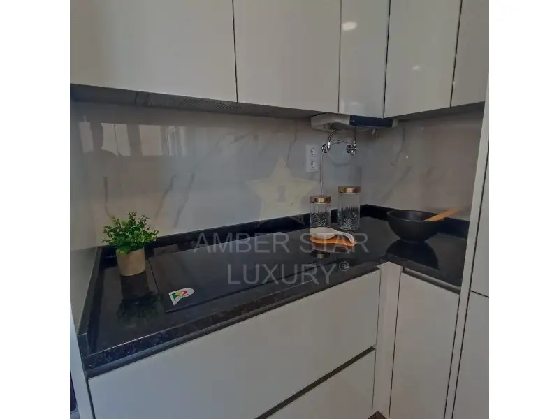 Квартира имеет просторную гостиную и кухню открытой планировки, полностью оборудованную встроенной бытовой техникой, идеально подходящую для общения.