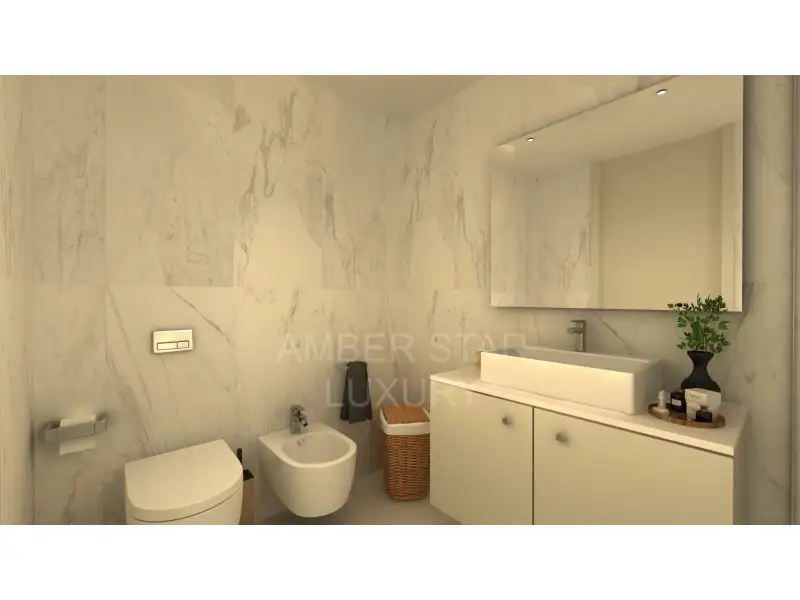 - Отделка премиум-класса: шкафы из термоламината, лакированные детали и подвесная сантехника с современным дизайном.