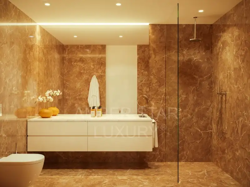 - Ванные комнаты с электрическим подогревом полов в сьютах и многослойным дубовым паркетом в общей ванной комнате, оборудованные подвесными сантехническими изделиями.