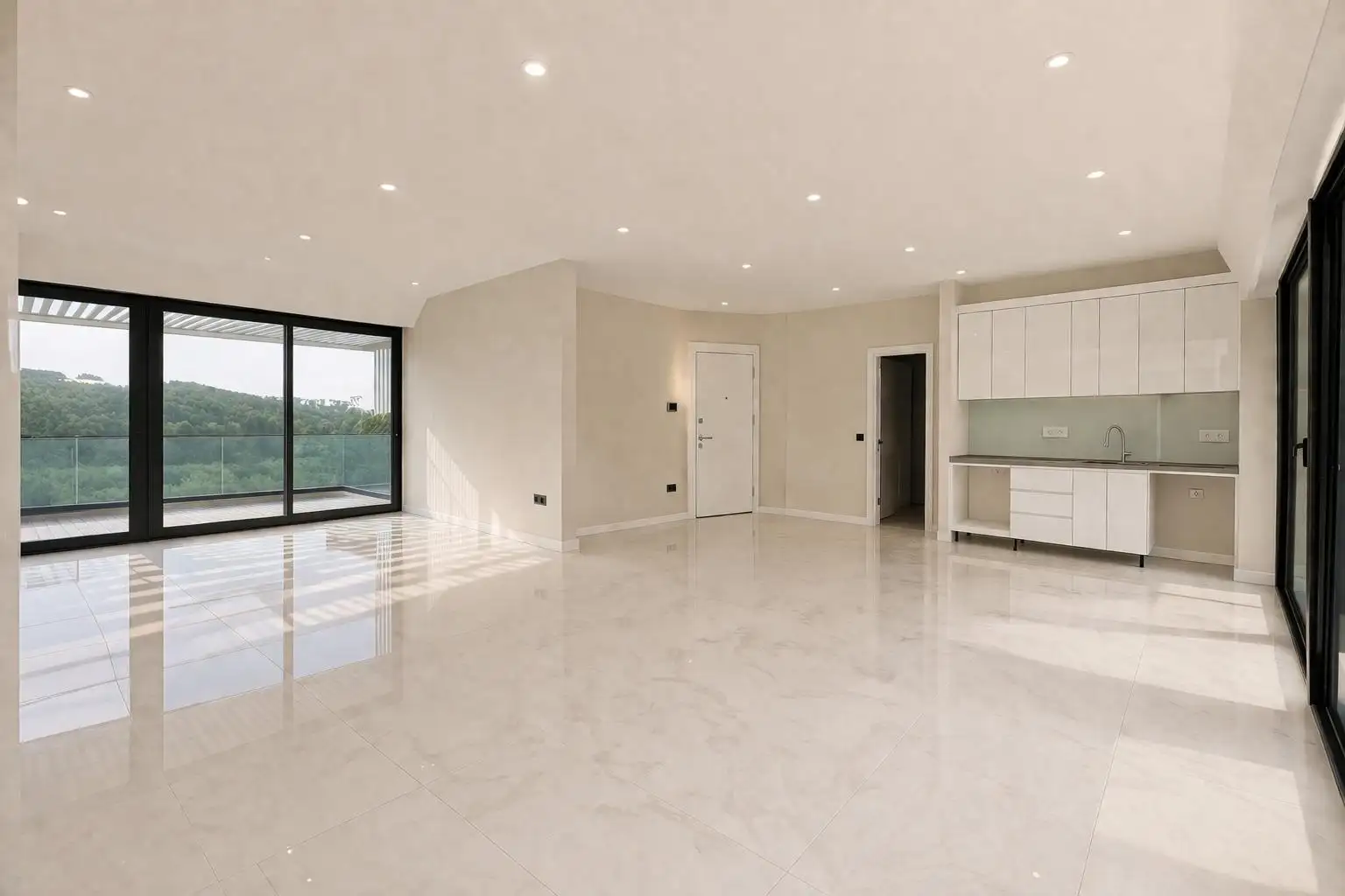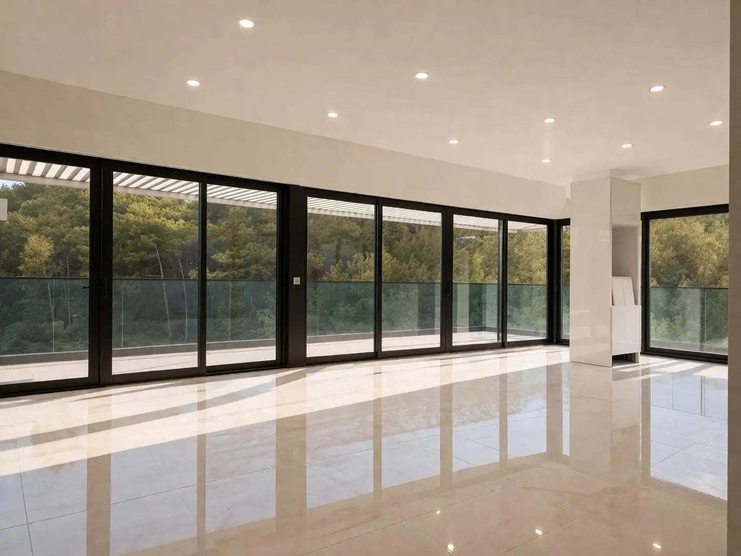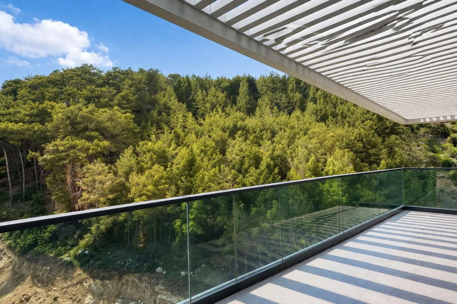 Пентхаус занимает 8-й и 9-й этажи 9-этажного здания и располагает двумя большими балконами. С одного балкона открывается вид на море, с другого — на нетронутый сосновый лес и горы. Благодаря расположению в охраняемой природной зоне квартира круглый год окружена чистым и свежим воздухом.
