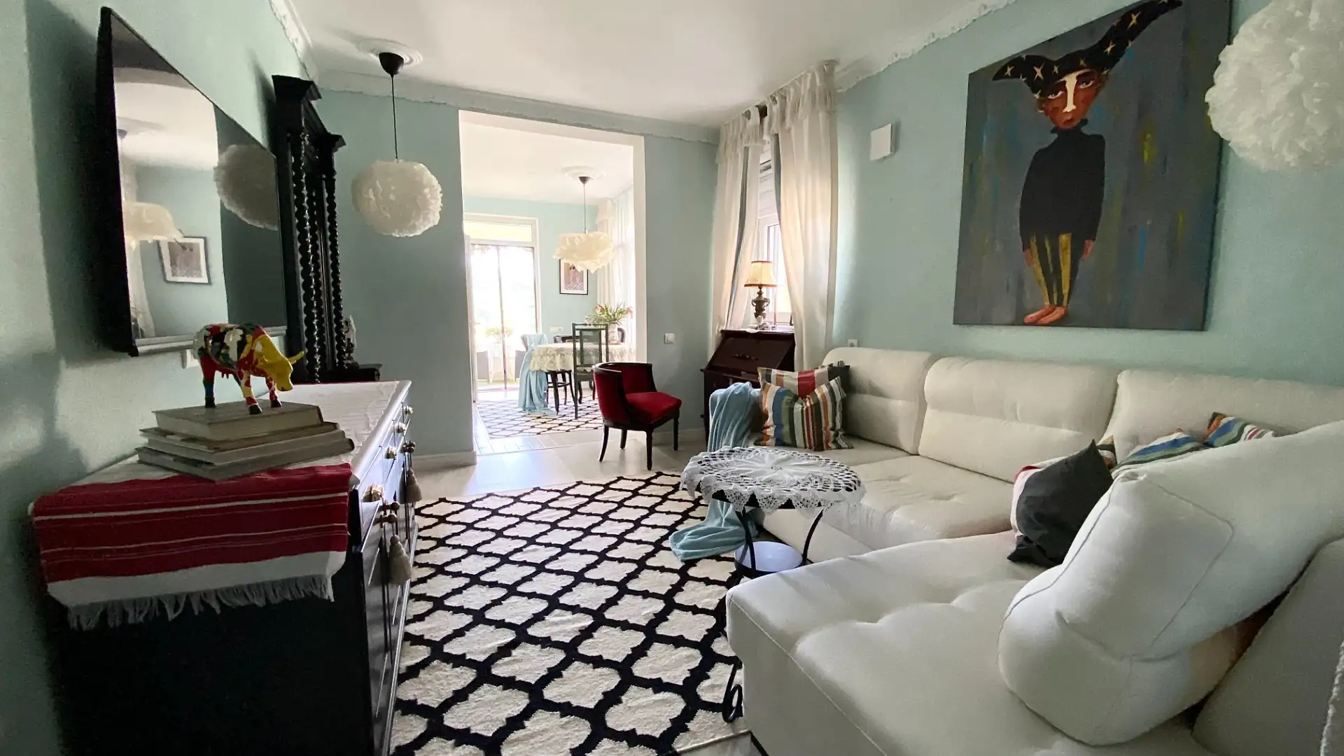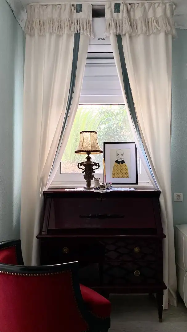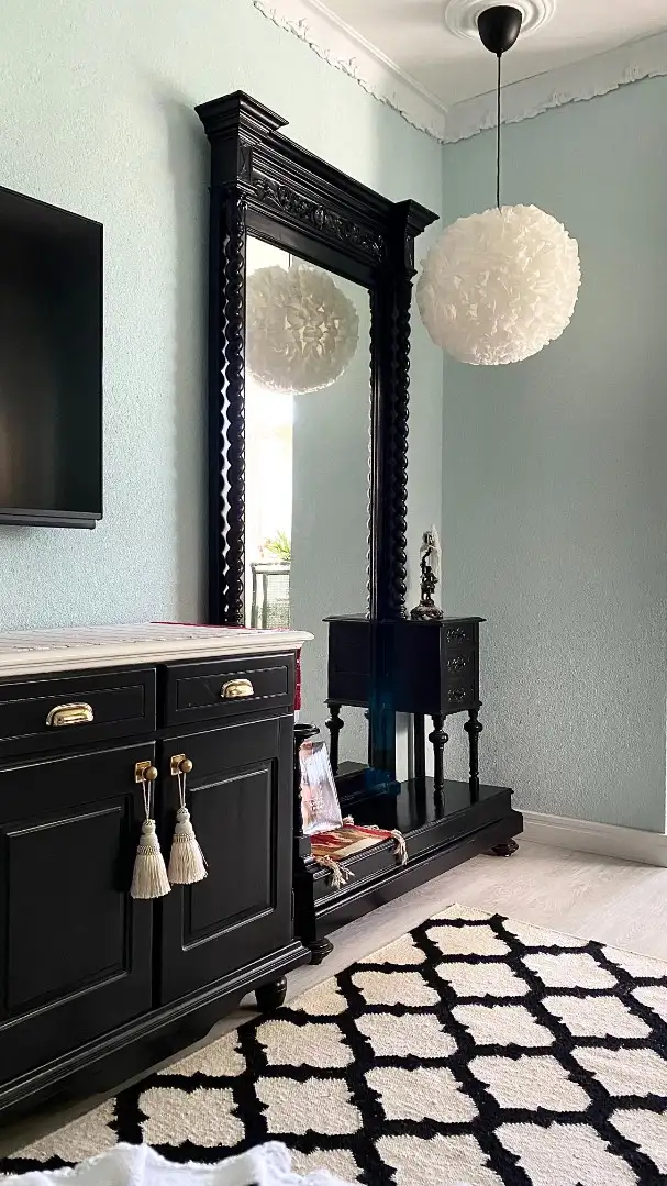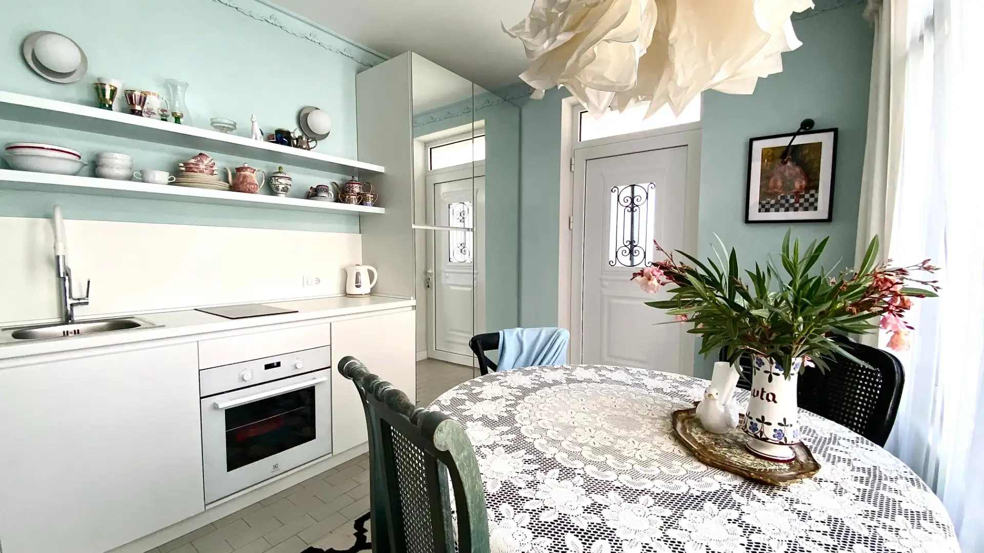 В интерьере — антикварная и изготовленная на заказ мебель, винтажная посуда, новые инженерные коммуникации и техника.