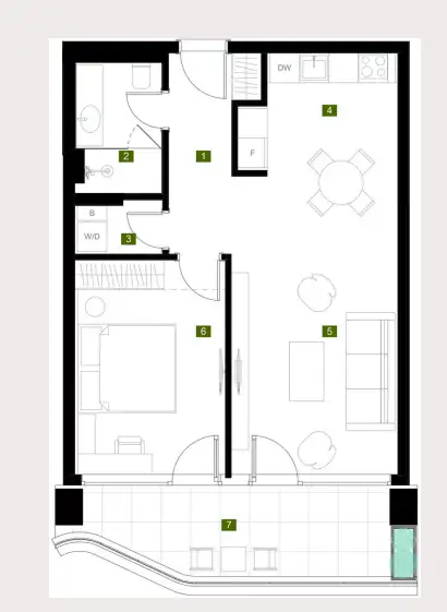 Планировка: прихожая, спальня, ванная комната, гостиная с кухней, прачечная, выход на террасу