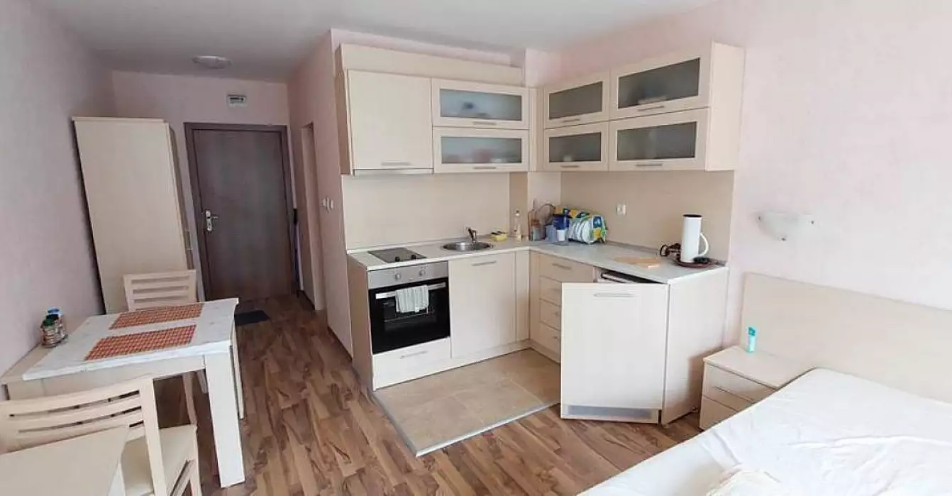 Светлая и приятно оформленная квартира-студия по отличной стоимости от агентства Болгарский Дом! В ЖК Си Бриз апартамент площадью 44 кв. м. в продаже. От собственников – полное оснащение мебелью и техникой в базовом наполнении: кухня с плитой, духовкой и мини-холодильником, кровати и стол, а также бойлер в санузле. В прихожей части вместительный шкаф, есть небольшой балкончик. Квартира с бюджетной чистовой отделкой, в хорошем жилом состоянии. Второй этаж с видом на прилегающую улицу.