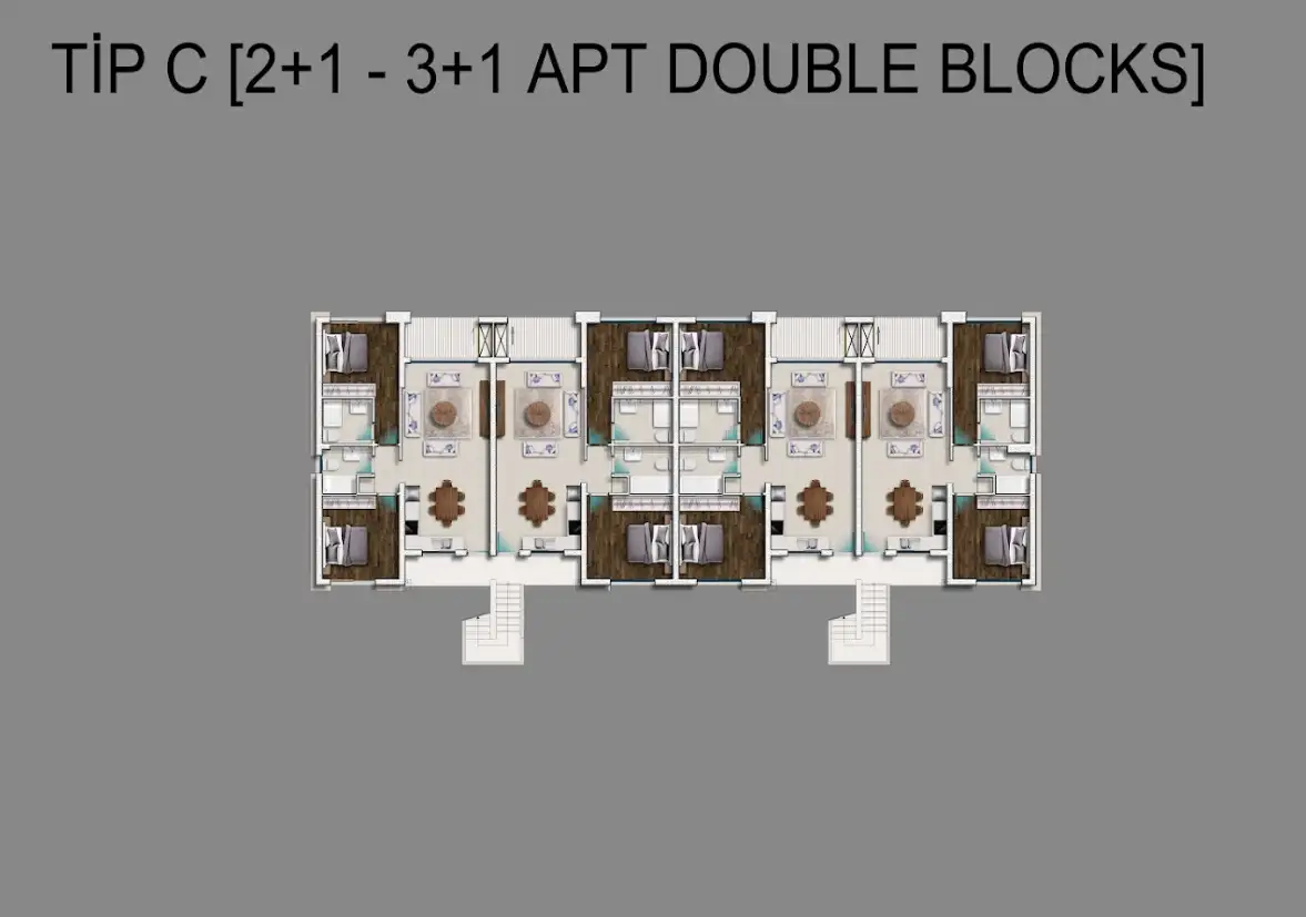 Предлагаются разнообразные планировки и метражи квартир, чтобы удовлетворить все ваши потребности. Вы можете выбрать между небольшими студиями 1+0 с выходом в сад (площадью 49м2), квартирами 1+1 с выходом в сад и дуплексами (площадью 79-99м2), 2+1 с выходом в сад и дуплексами (площадью 119м2), пентхаусами 3+1 (площадью 119-144 м2) и бунгало (площадью 295м2).