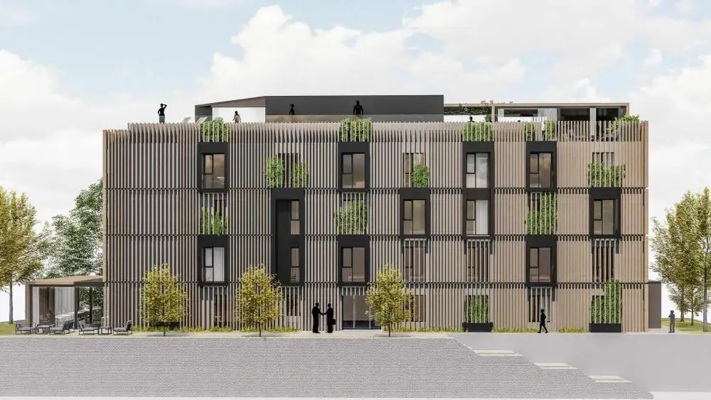 Архитектурно проект сосредоточен на современном визуальном облике, подчеркивая вертикальные деревянные элементы и интегрированную зелень на фасаде, создавая современную и привлекательную эстетику в гармонии с городской средой.