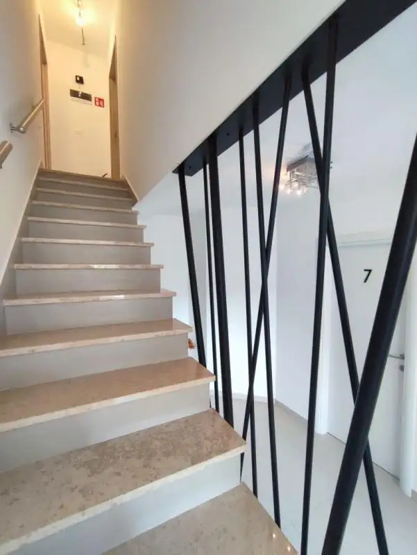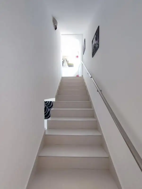 Поднявшись по лестнице, вы попадаете на верхний этаж, где расположены еще четыре просторных жилых дома, каждый из которых имеет прихожую, ванную комнату и спальную зону с меньшей жилой площадью. В одном из жилых помещений также есть собственный тренажерный зал.
