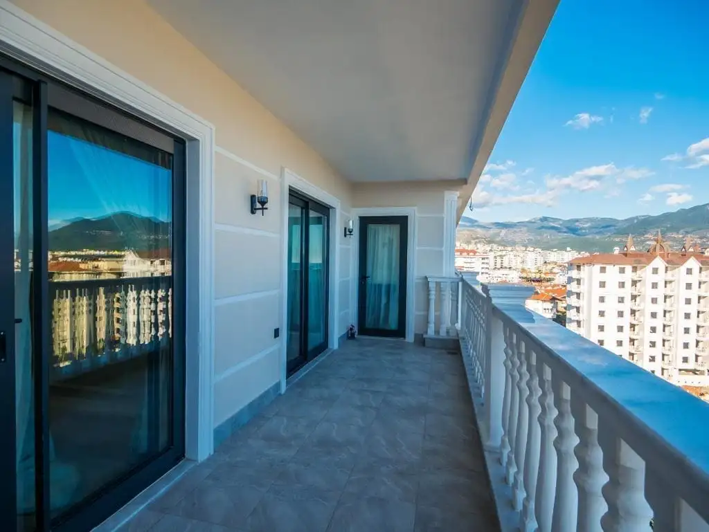 Внутри: В продаже представлен двухуровневый пентхаус с видом на море и горы. Хорошая просторная планировка 4+1, общая площадь которого составляет 196 м2. Апартаменты с эксклюзивным дизайном полностью меблированы и готовы встретить своего нового владельца. При строительстве застройщик позаботился о вашем комфорте и установил полы с подогревом в санузлах, на полу уложены паркет и керамогранит.
