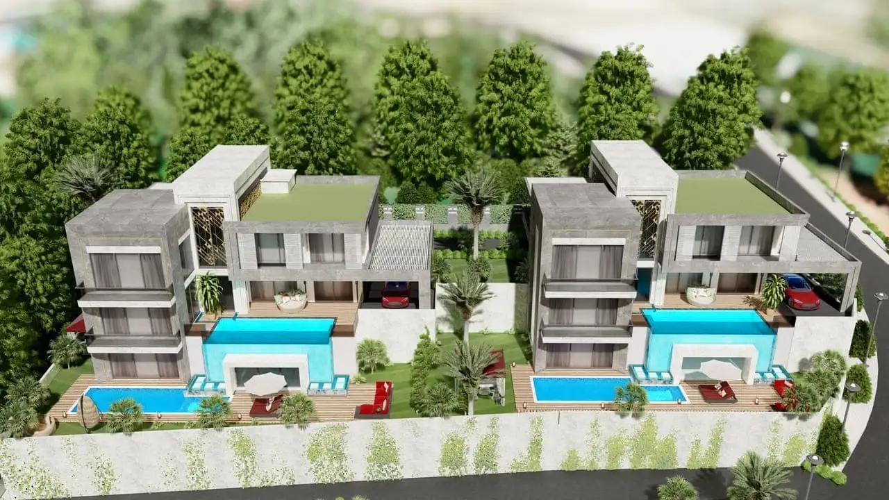 • Планировка 4+1 имеет общую площадь - 465 м2, жилую площадь – 260 м2, и включает в себя 4 спальни и 1 гостиную. Виллы расположены на земельном участке общей площадью 532 м2 и 533 м2;