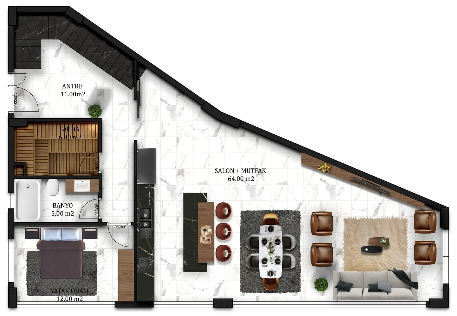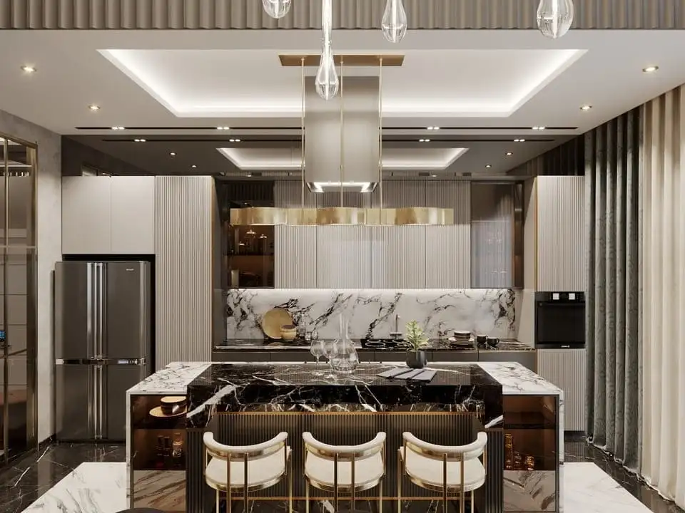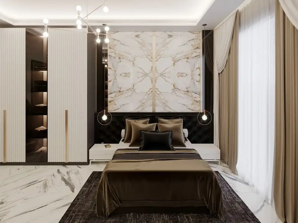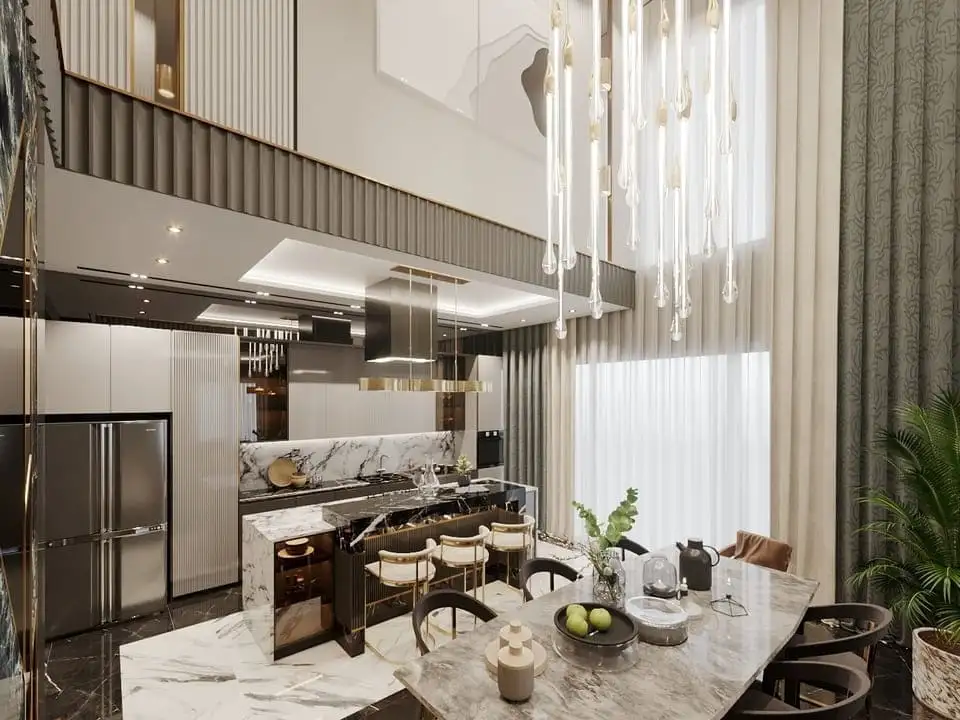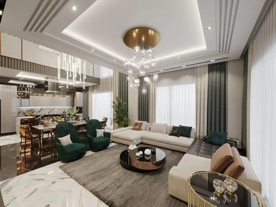 Вилла просторной планировкой 4+1, площадью 185 м2 позволяет разместить в себе гостиную, совмещенную с американской кухней, 4 спальни, 4 санузла, 2 балкона.