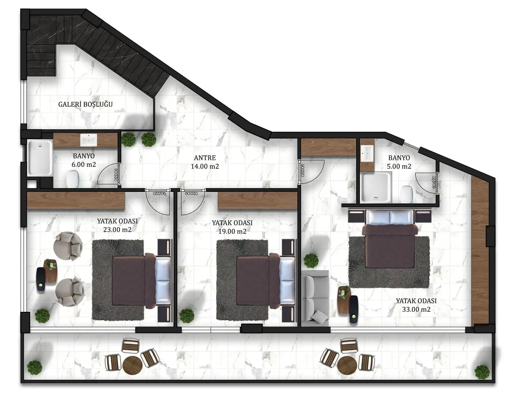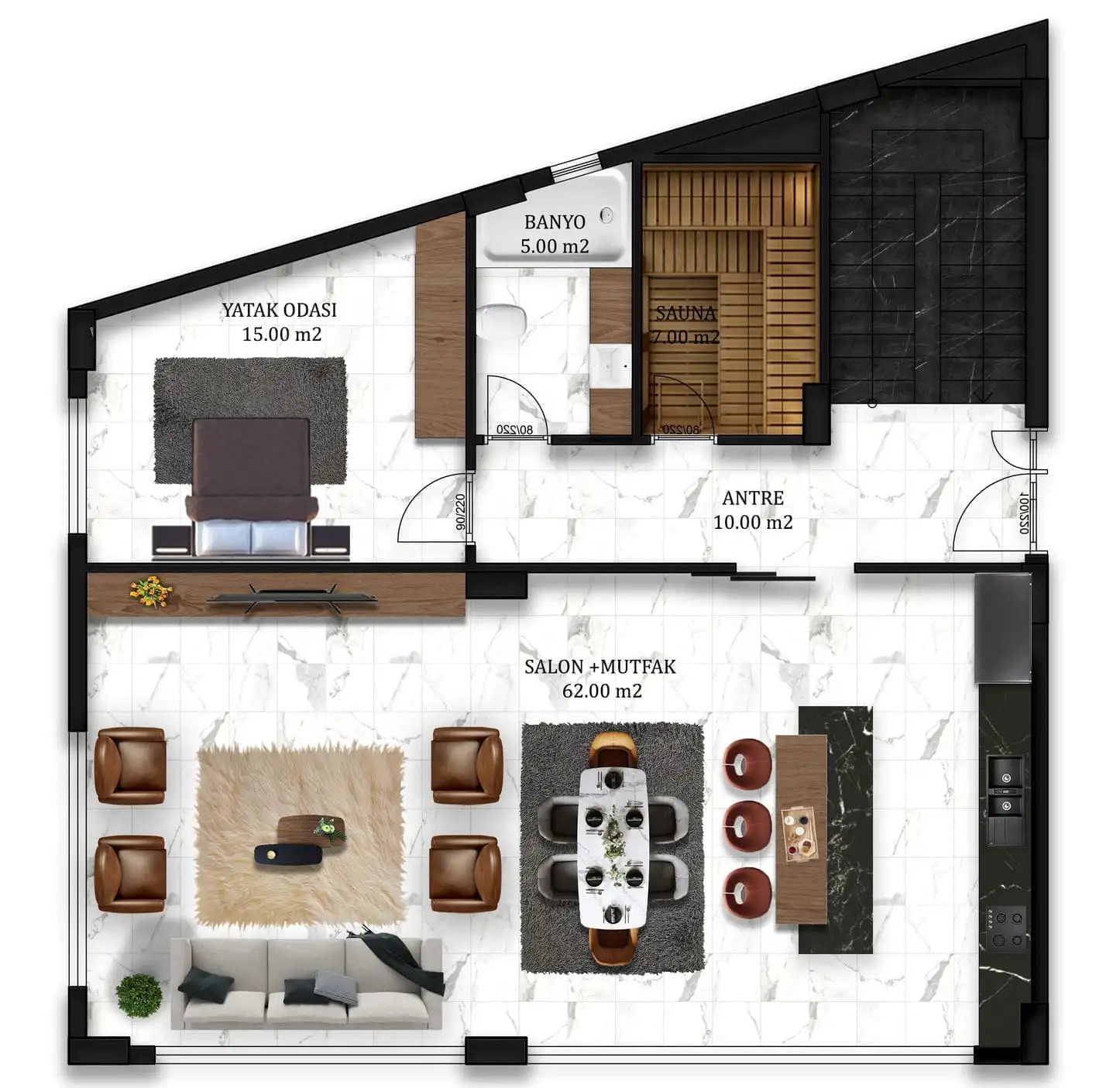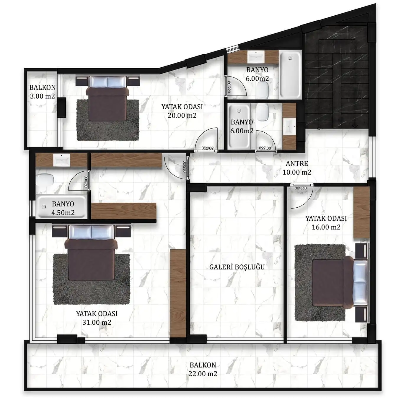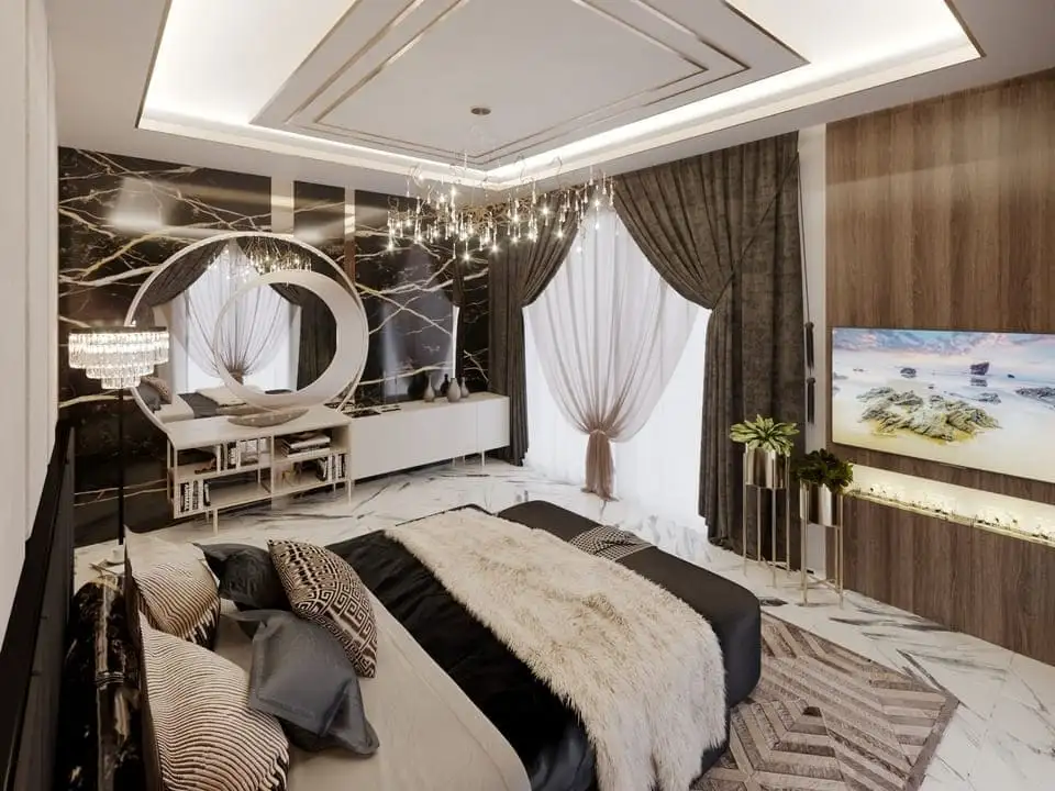 Вилла просторной планировкой 4+1, площадью 185 м2 позволяет разместить в себе гостиную, совмещенную с американской кухней, 4 спальни, 4 санузла, 2 балкона.