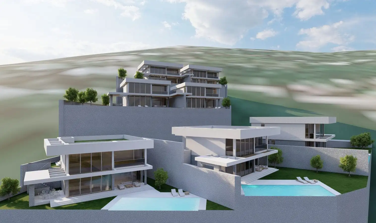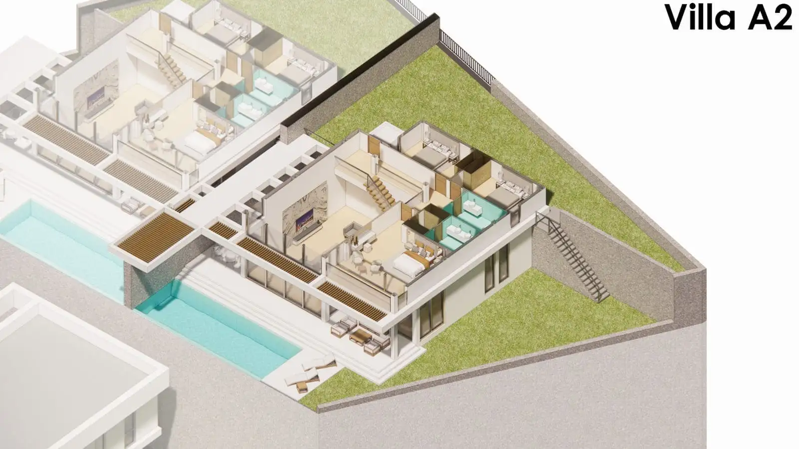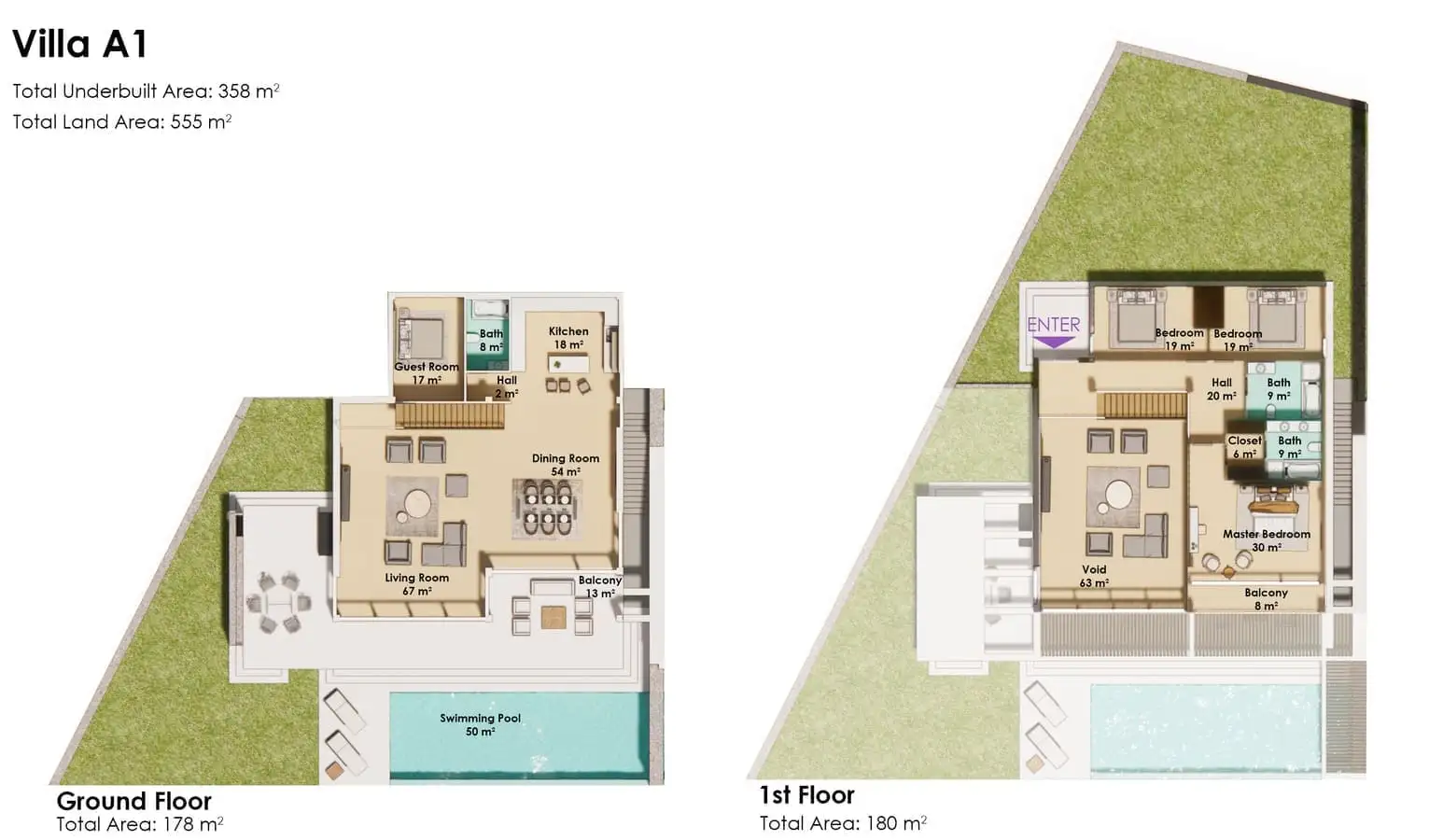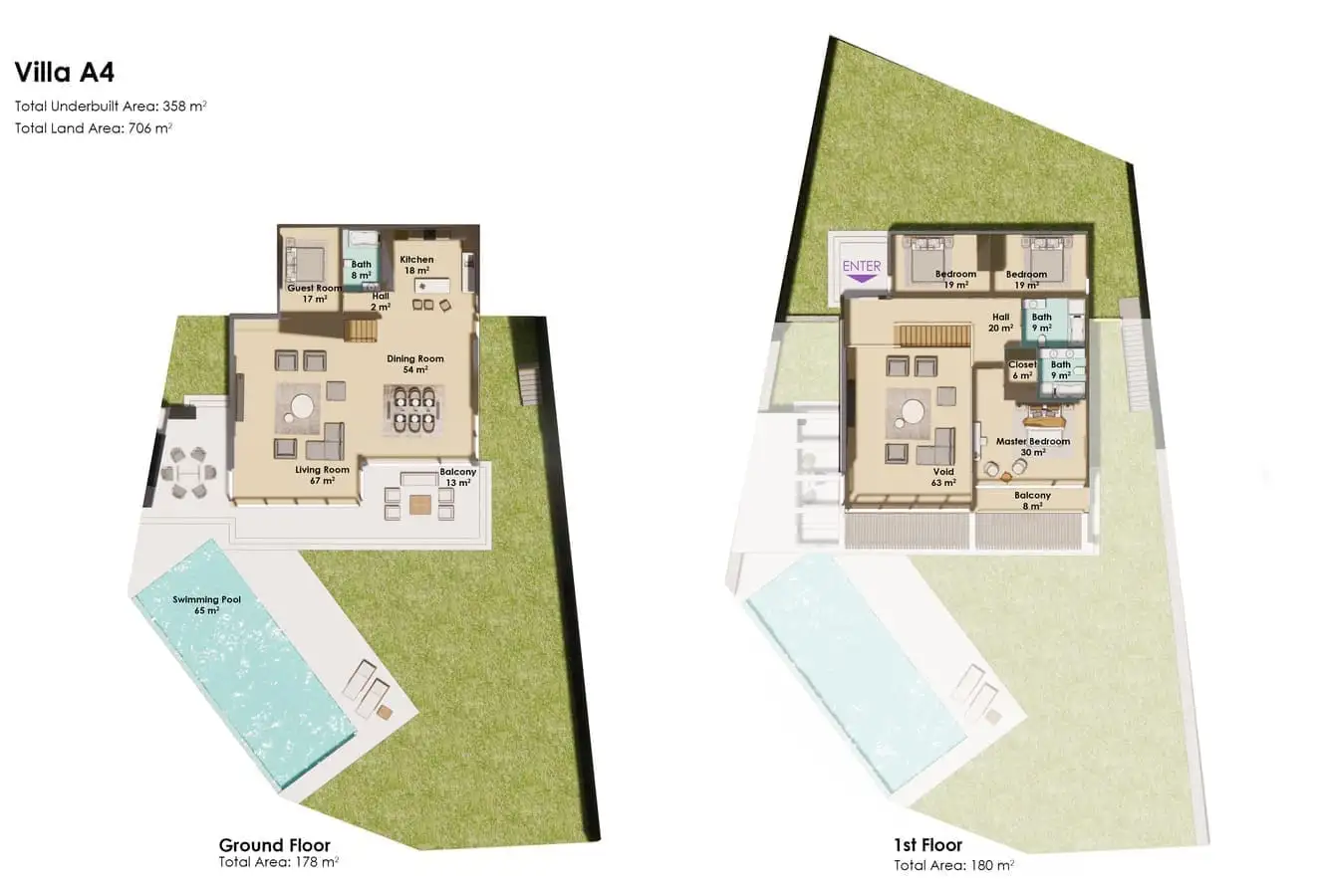 На закрытой территории каждой виллы площадью от 528 м2 до 709 м2 будет расположена двухэтажная вилла, открытый бассейн, зона отдыха у бассейна, открытая парковка.