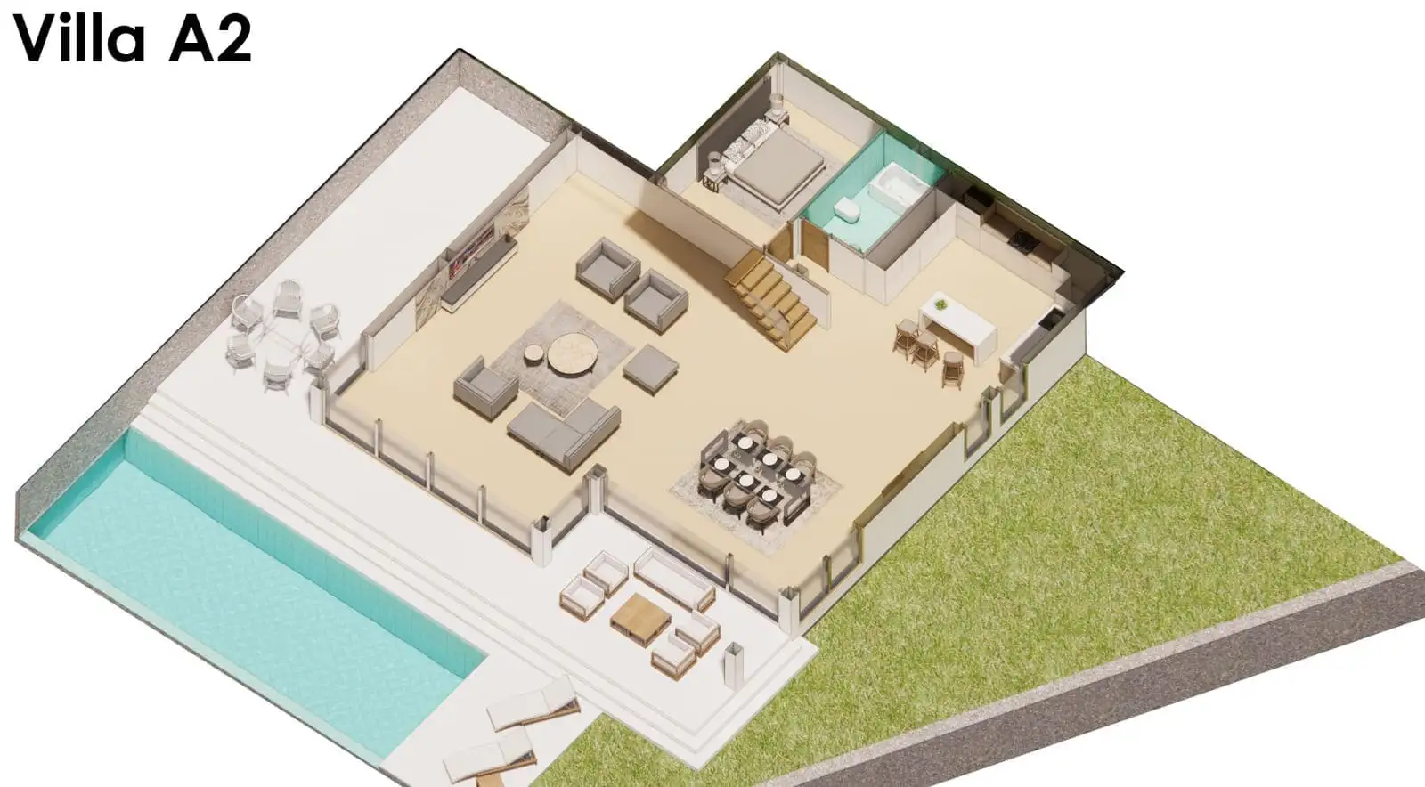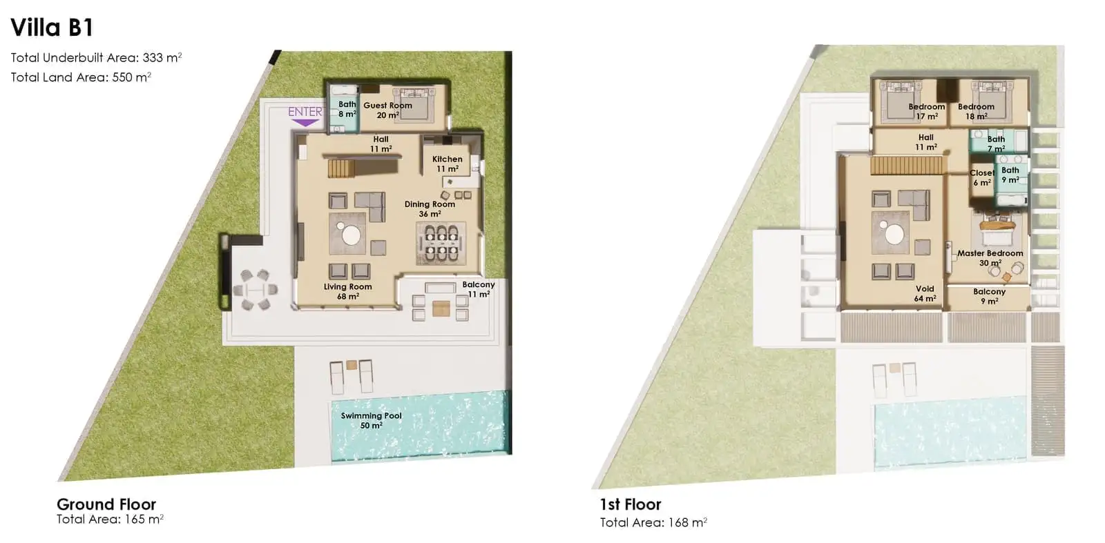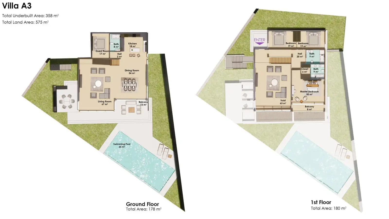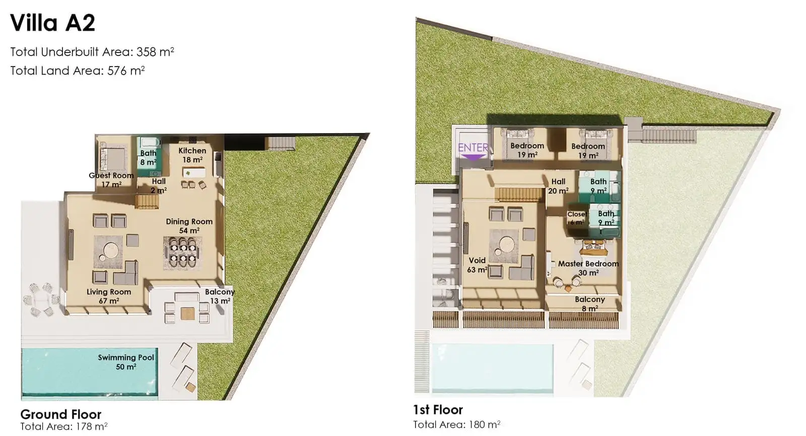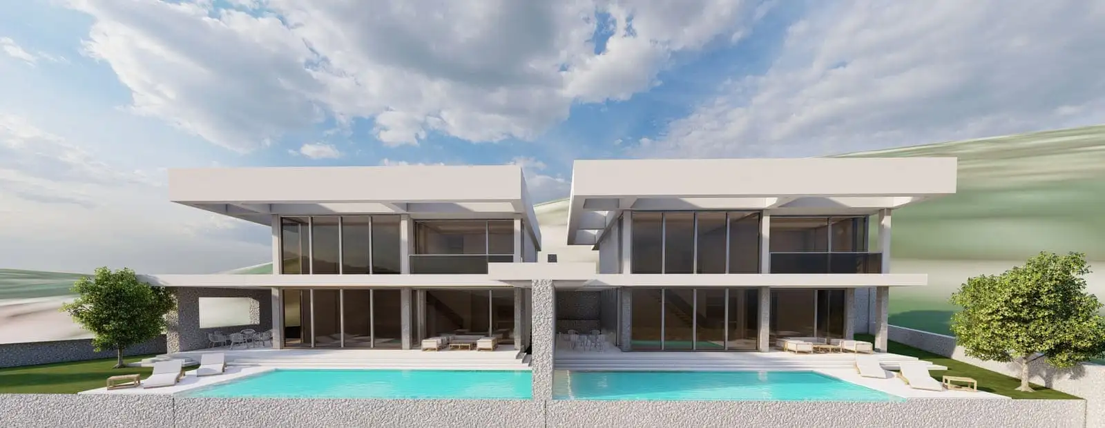 На закрытой территории каждой виллы площадью от 528 м2 до 709 м2 будет расположена двухэтажная вилла, открытый бассейн, зона отдыха у бассейна, открытая парковка.