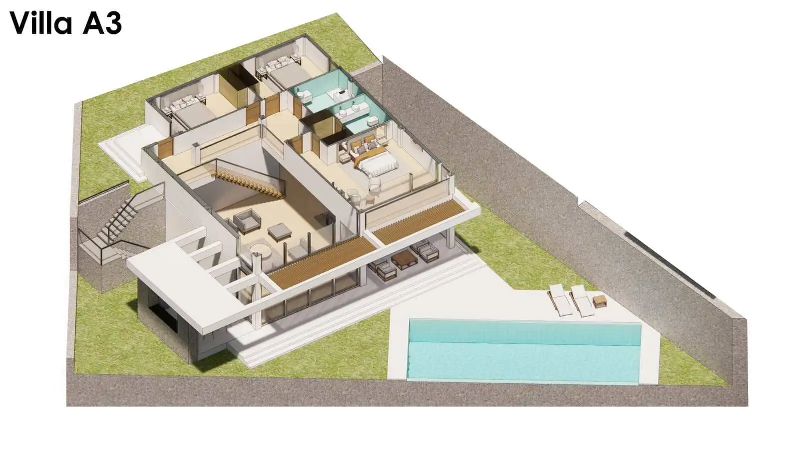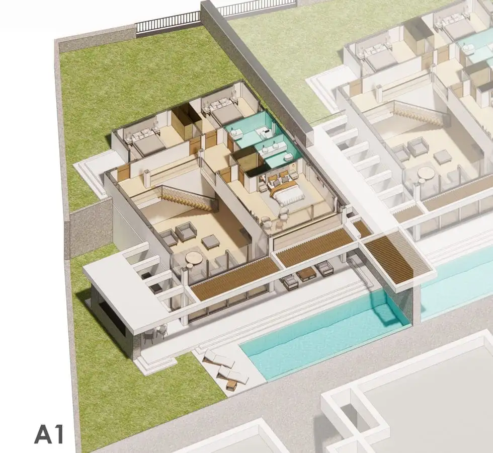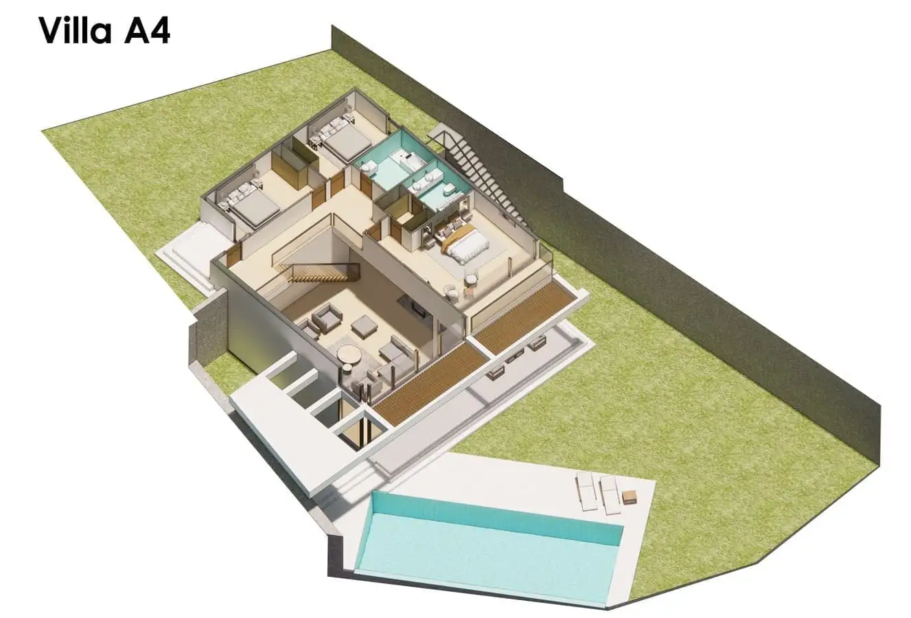 Внутри: Планировка вилл 4+1 площадью 333 м2 и 358 м2 позволяет разместить в себе гостиную, совмещенную с кухней, 4 спальни, 3 ванные комнаты и балкон.
