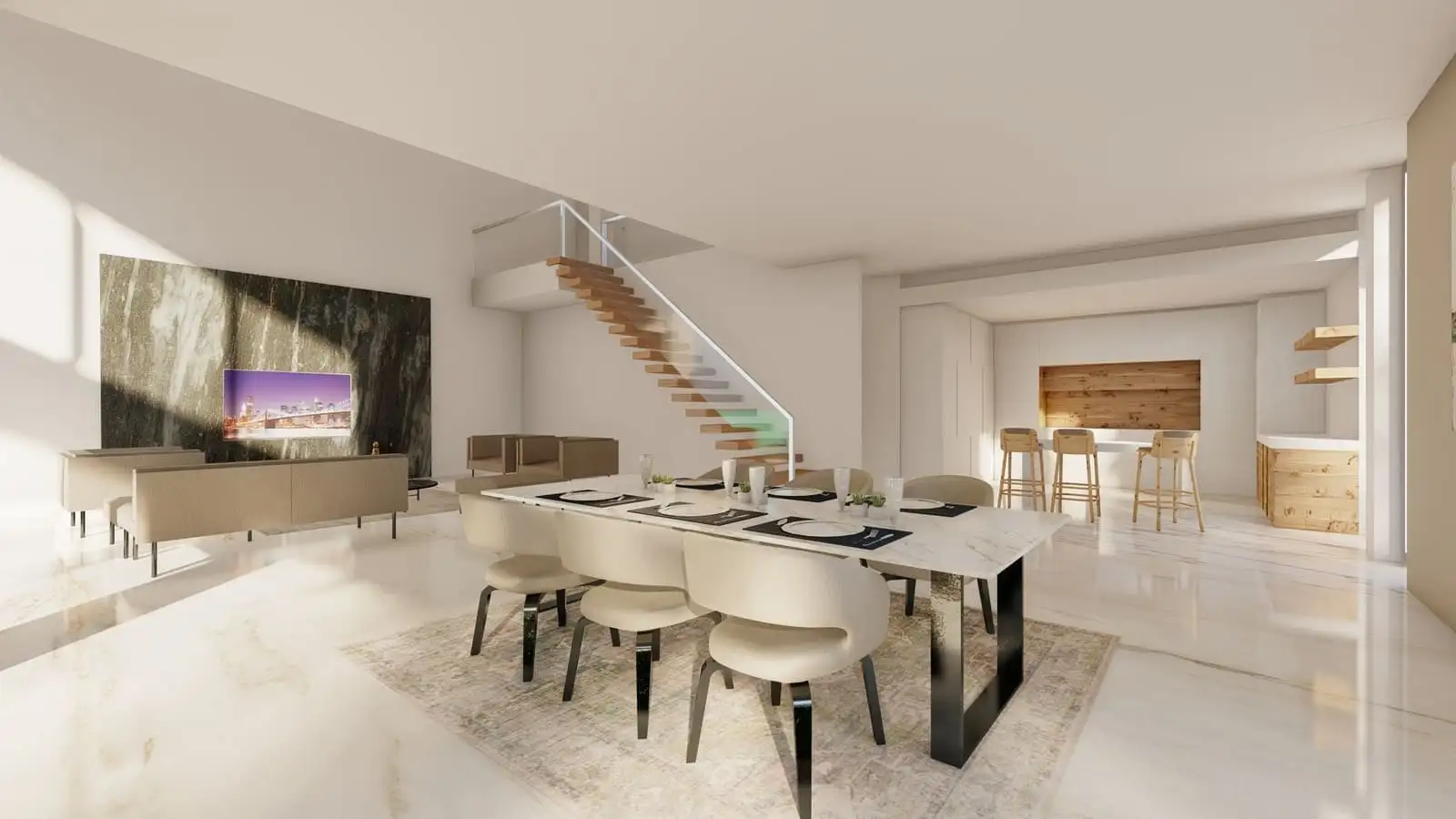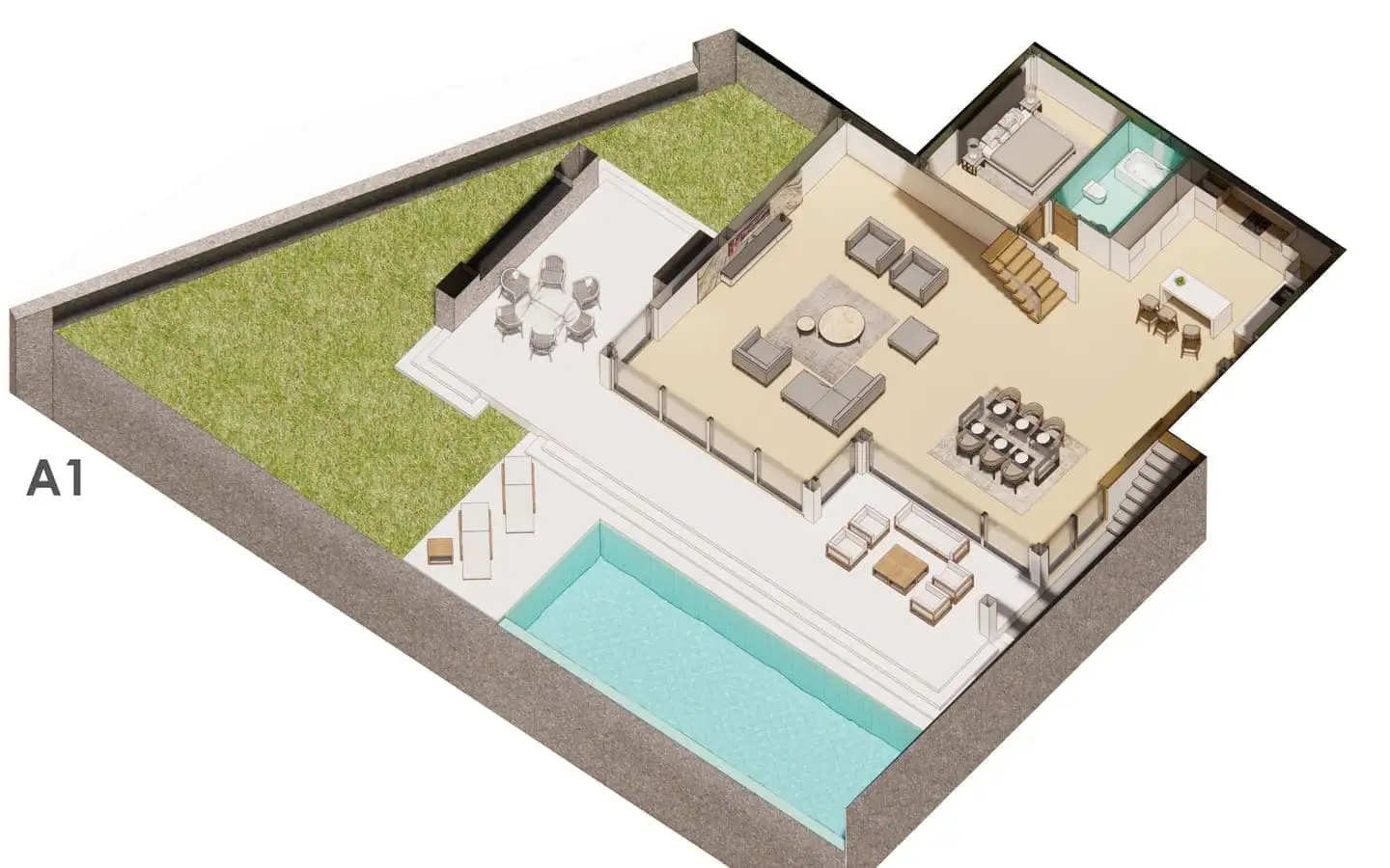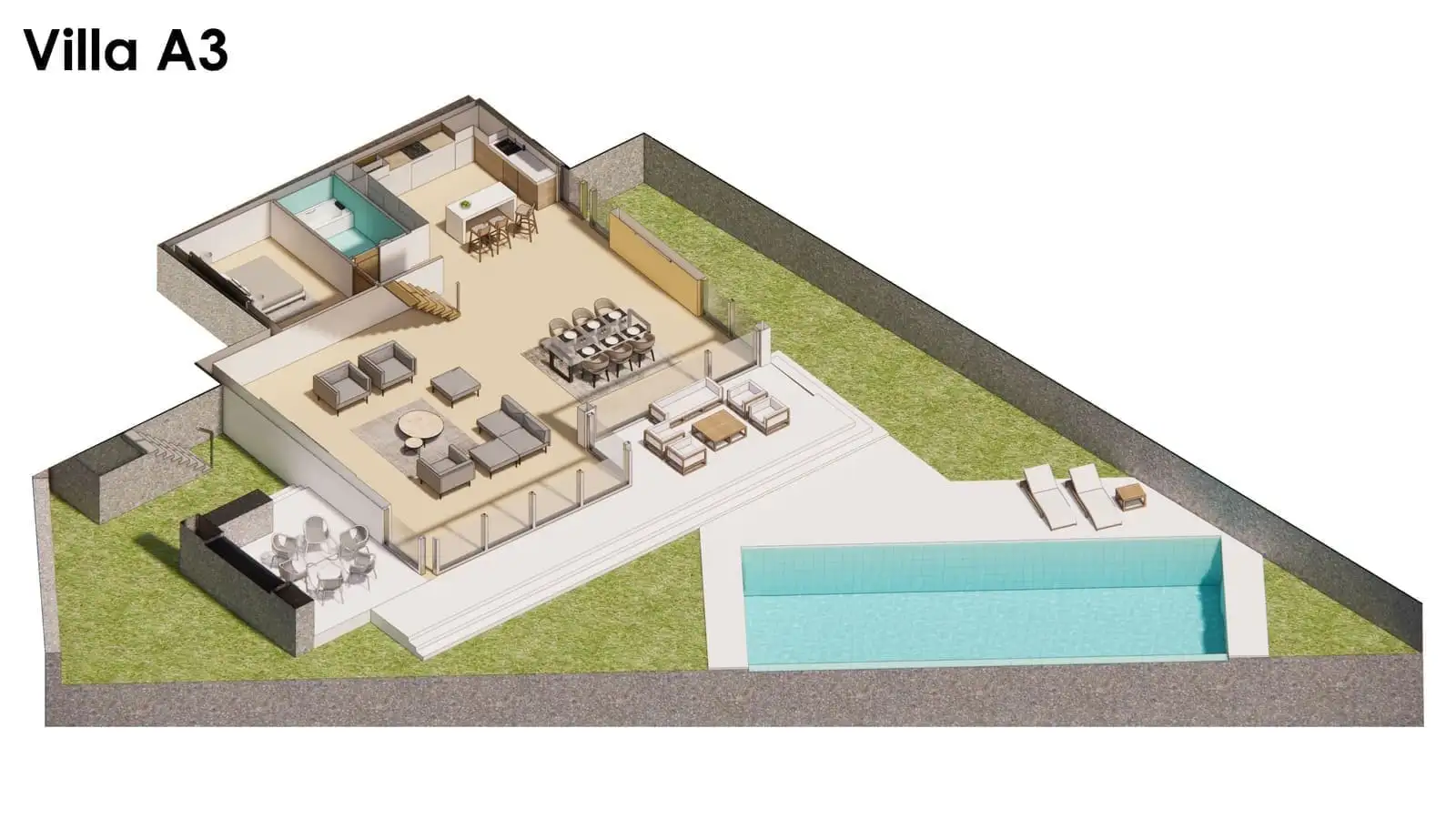 Внутри: Планировка вилл 4+1 площадью 333 м2 и 358 м2 позволяет разместить в себе гостиную, совмещенную с кухней, 4 спальни, 3 ванные комнаты и балкон.