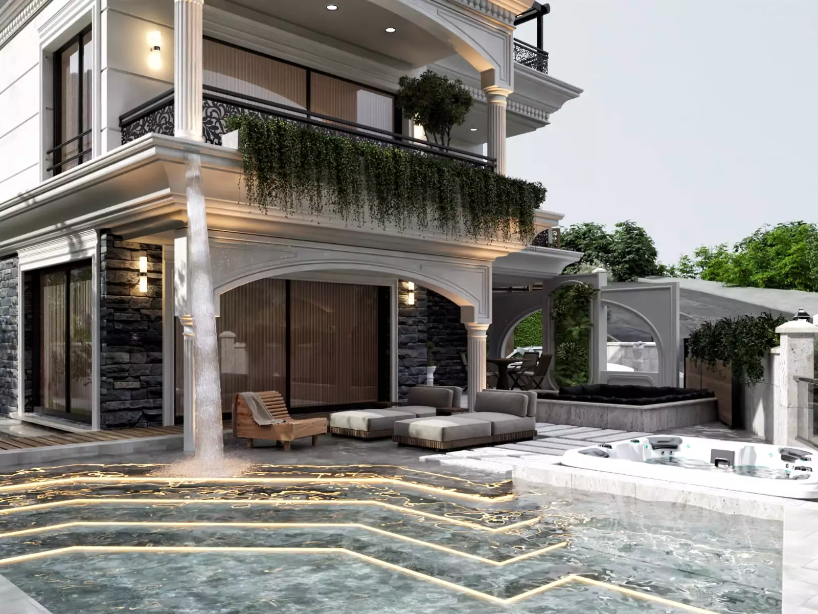 Что в комплексе: На закрытой, озелененной территории площадью 502 м2 будут расположена 1 вилла в 4 этажа, открытый бассейн, парковка на 2 автомобиля, гараж на 1 машину, беседка с зоной барбекю, джакузи. В комплексе будет установлена система видеонаблюдения.
