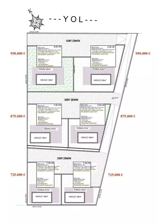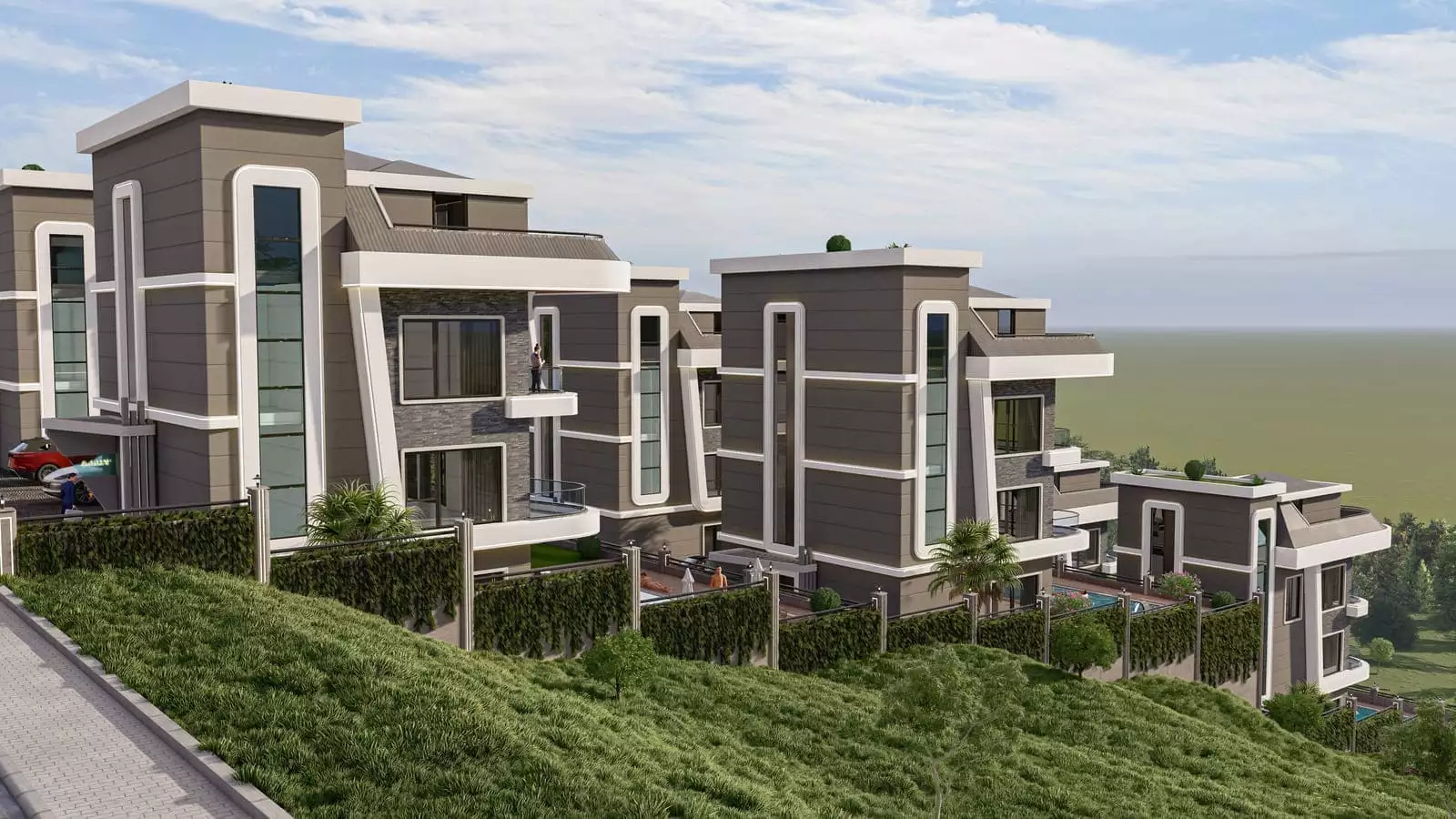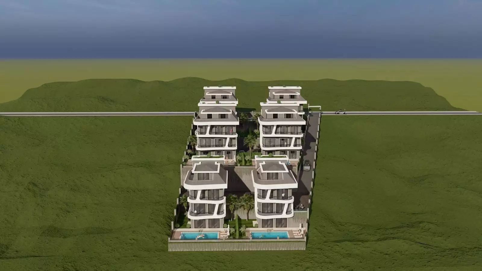 Что в комплексе: Комплекс состоит из 6 отдельно стоящих вилл с частными бассейнами. На территории виллы будет расположен открытый бассейн, детский бассейн, джакузи, финская сауна, беседка для отдыха и барбекю, открытая парковка для авто, генератор. Территория будет находиться под круглосуточным видеонаблюдением.