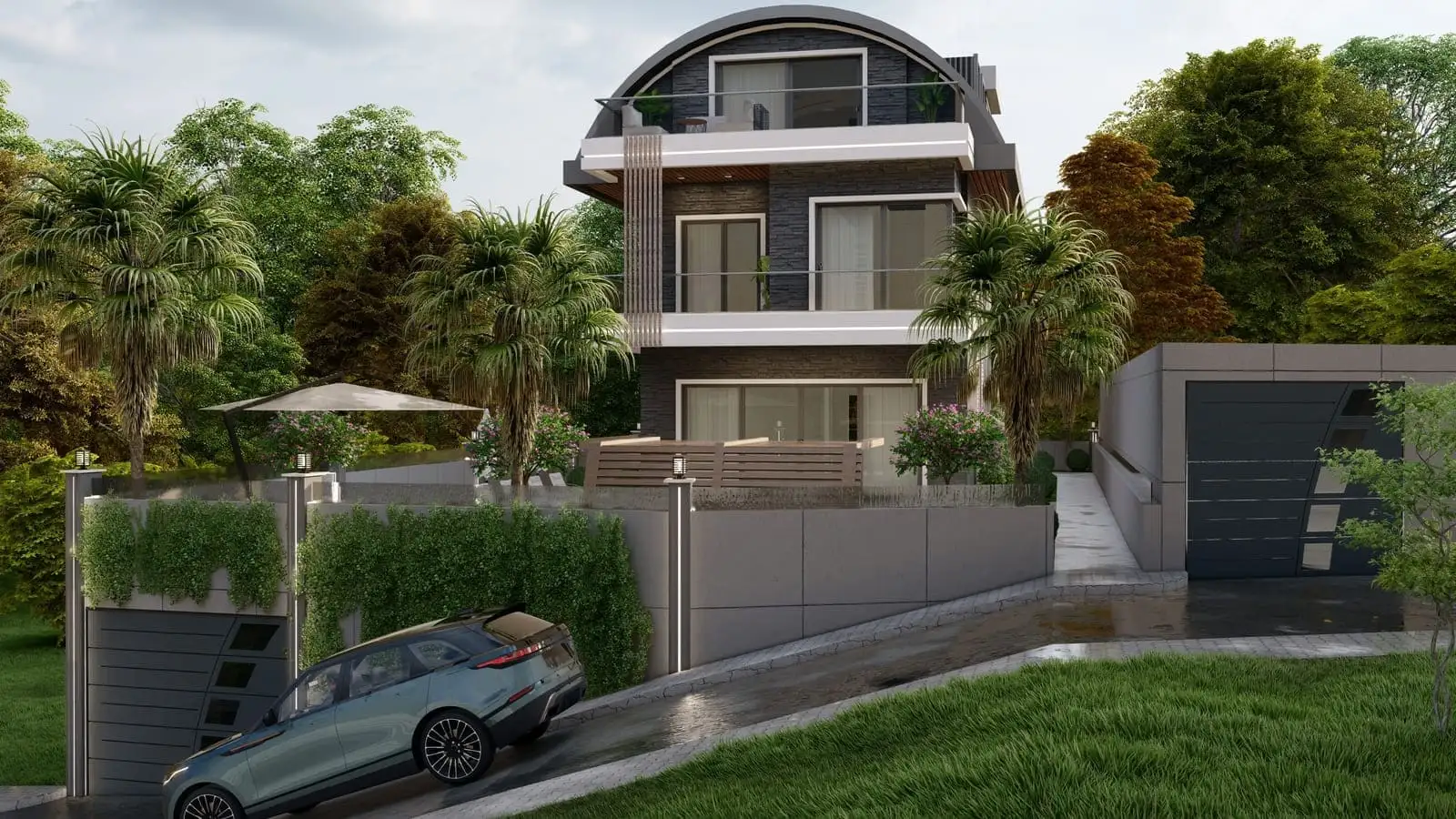 Внутри: Виллы имеют уютную, озелененную территорию, на которой расположен трехэтажный дом.