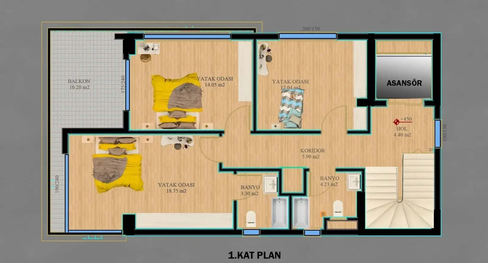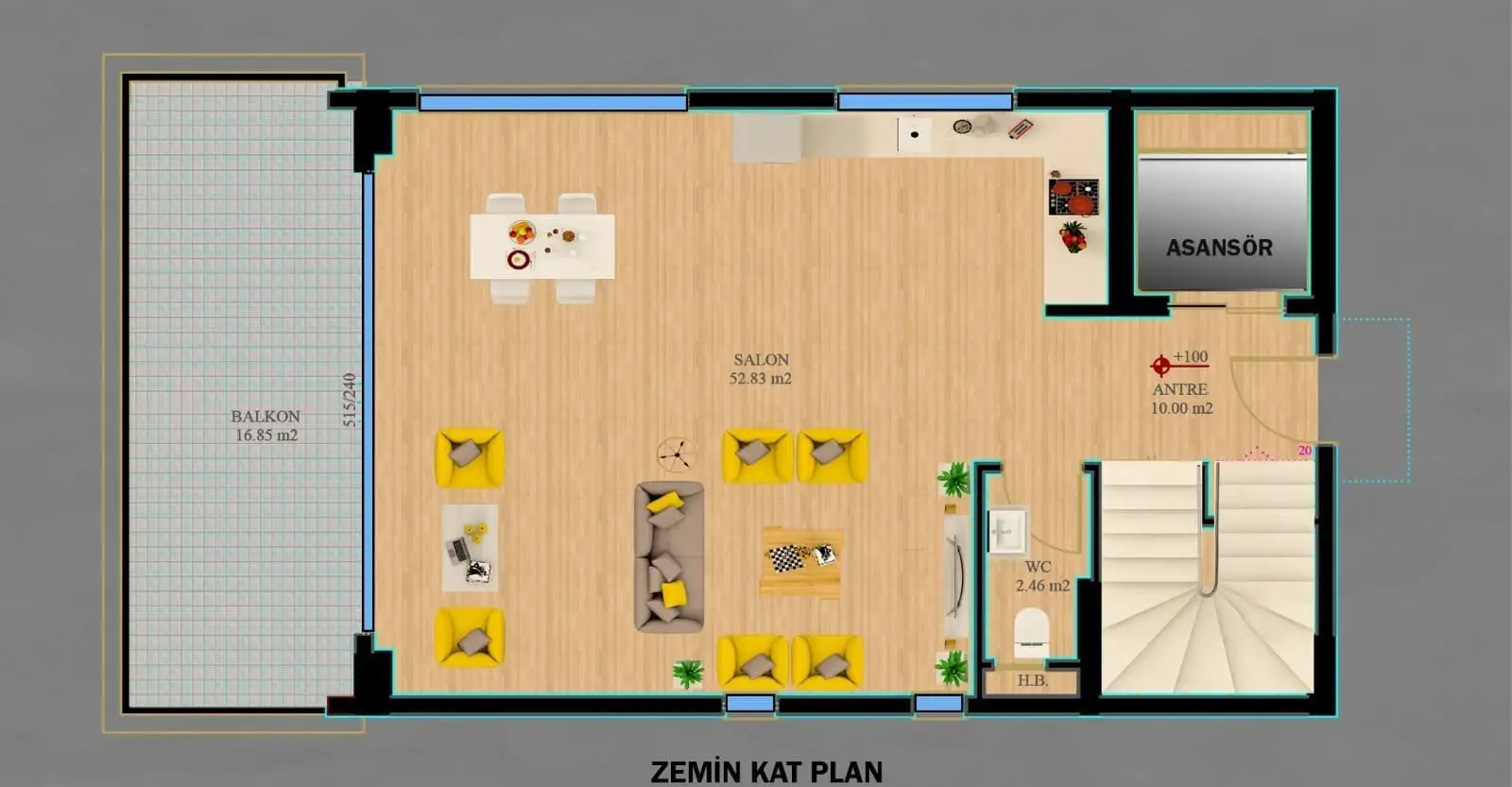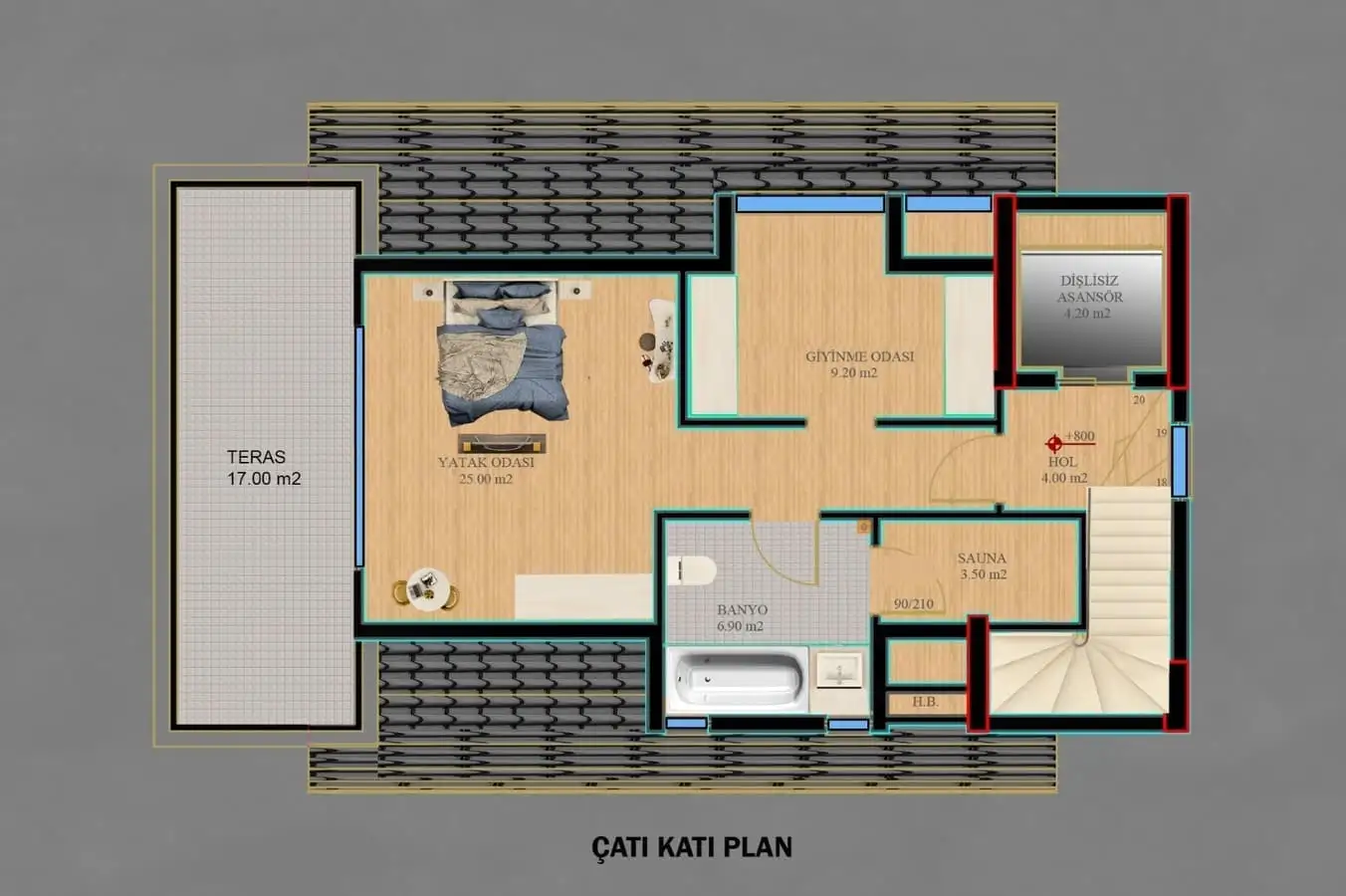 Просторная планировка 4+1, площадью 387 м2 позволяет разместить в себе гостиную, совмещенную с кухней, 4 спальни, 4 санузла, 2 балкона и террасу, гардеробную, финскую сауну, джакузи, гараж; будет установлен лифт.