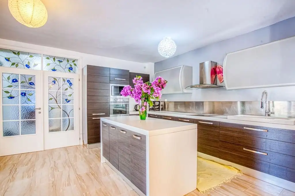 Вилла состоит из 17 помещений на 4 этажах, в том числе: - столовая, гостиная, холл, кухня, детская, кладовая, - 6 спален с двуспальными кроватями, 3 спальни с односпальными кроватями, - гараж и техническое помещение.