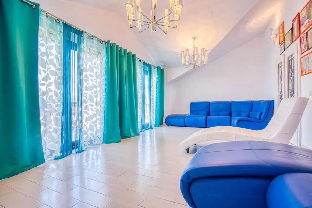 4 этаж - 1 изолированный двухместный номер с санузлом. - 1 изолированный блок номеров, состоящий из 1 двухместной и 1 одноместной комнаты и 1 санузла. - гостиная с диванами и выходом на большой балкон с видом на море и старый город.