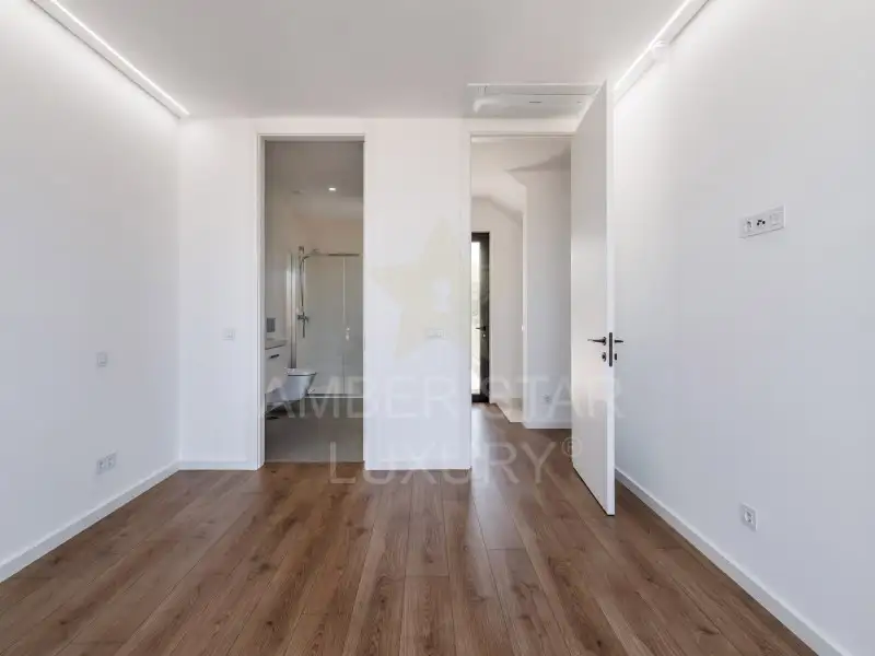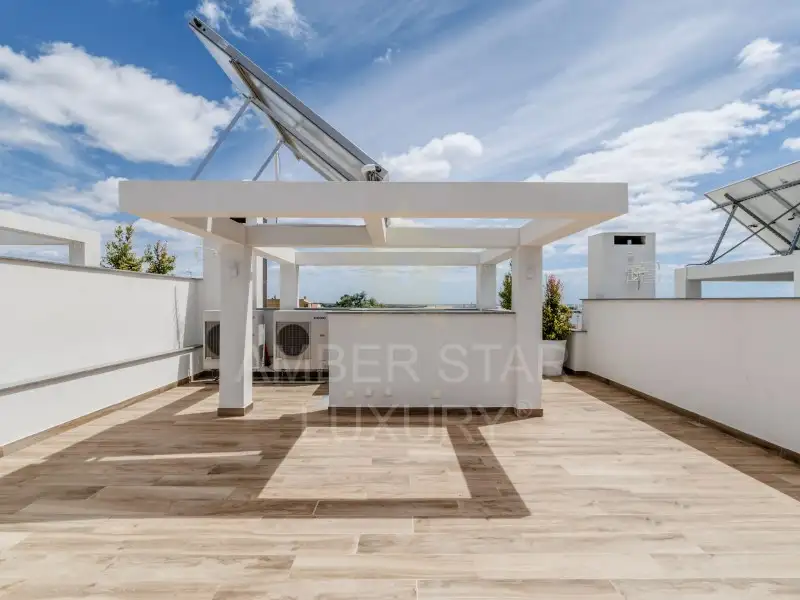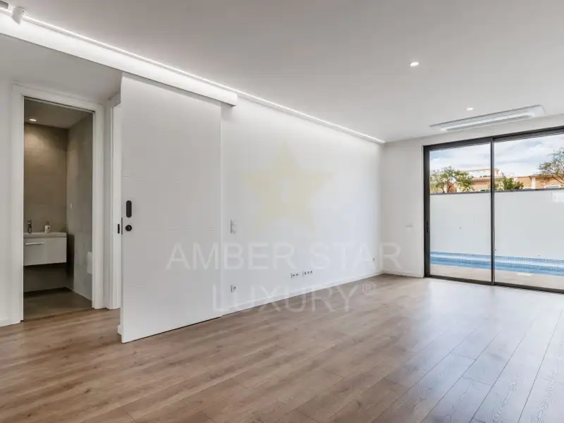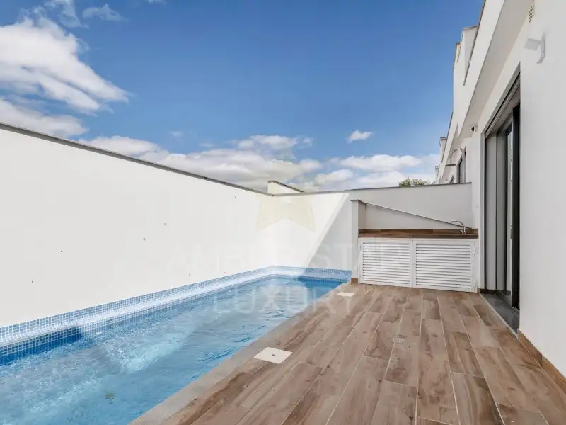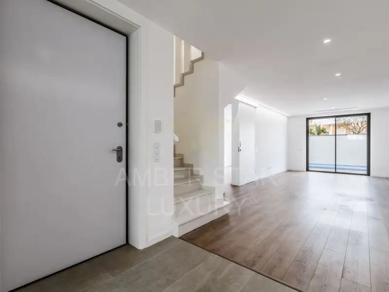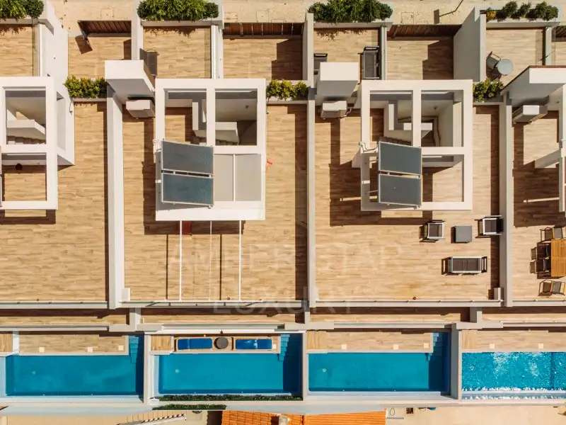 - Первый этаж: прихожая, оборудованная кухня открытого плана с гостиной и столовой, ванная комната, одна спальня и внутренний дворик с зоной для барбекю и частным бассейном.