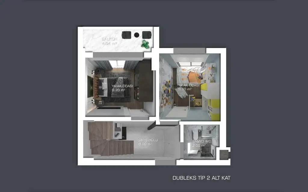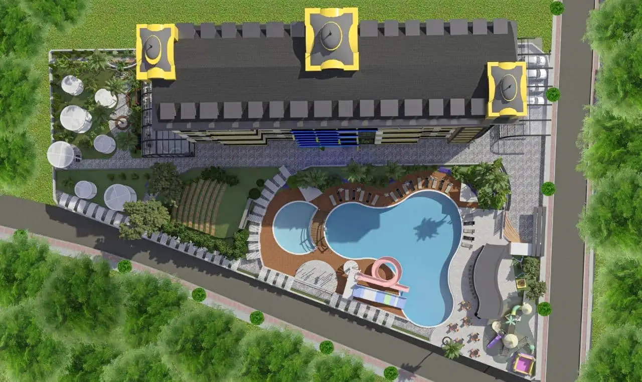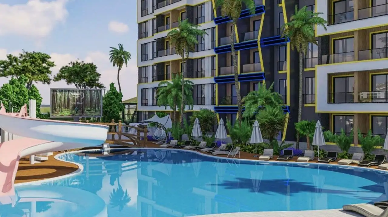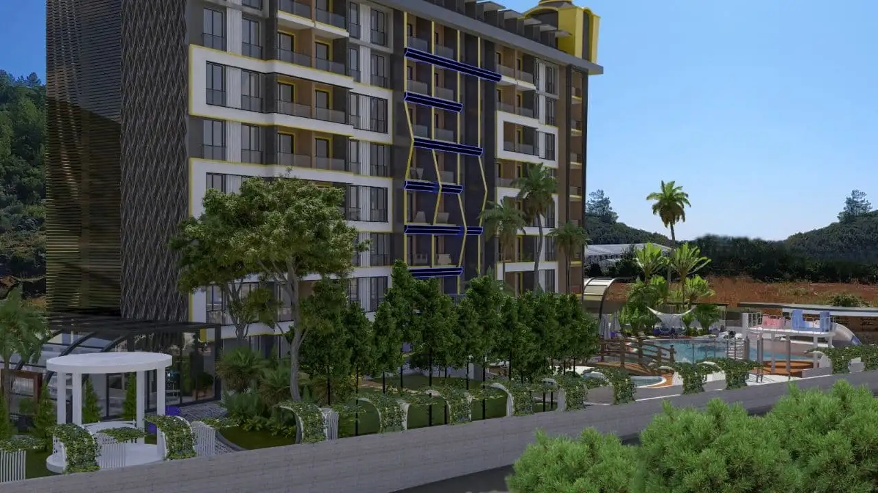 Внутри: Апартаменты расположены на 6 и 7 этаже и предлагаются в стандартной чистовой отделке. Пентхаус 2+1 имеет площадь 100 м2 и включает в себя совмещённую с кухней гостиную комнату, две спальни, две ванные комнаты и два балкона и видом на бассейн, территорию и просторы Газипаши.