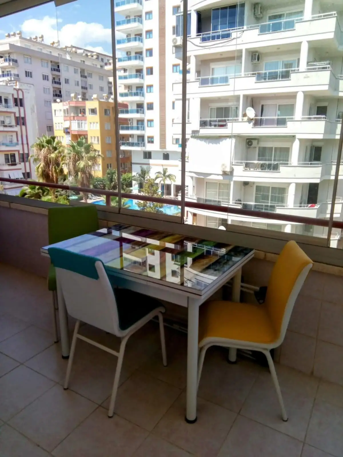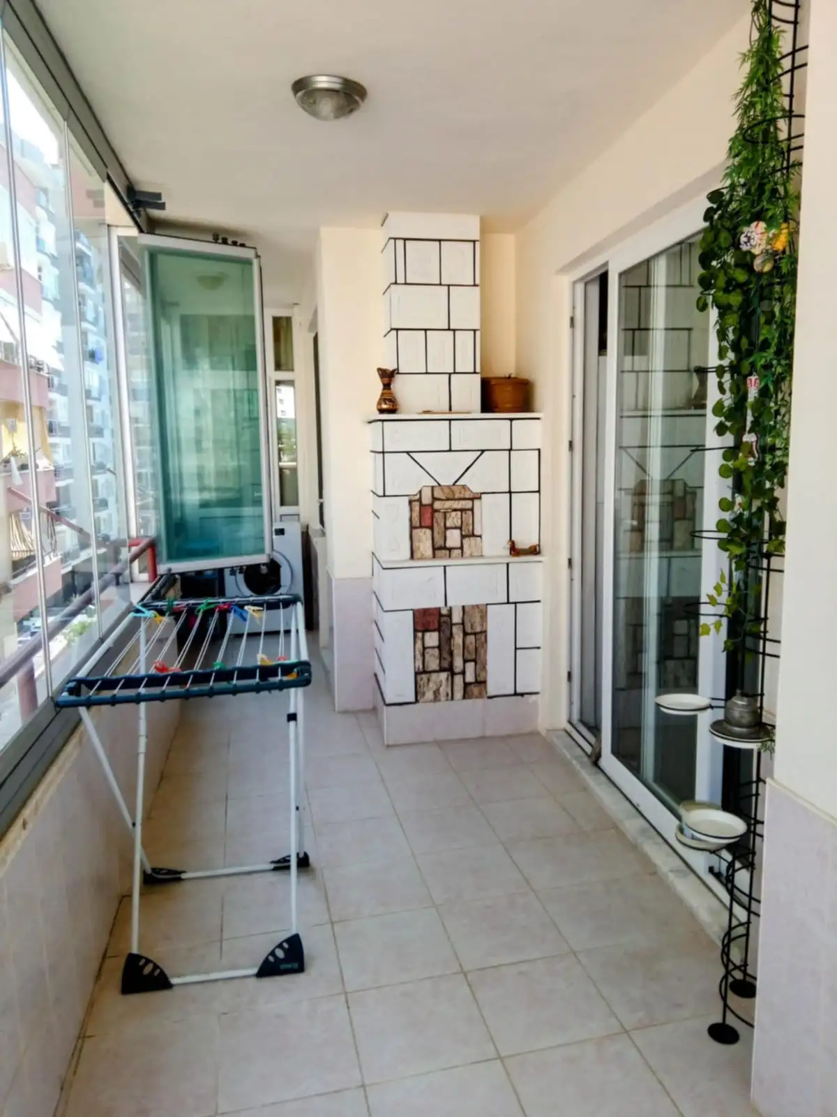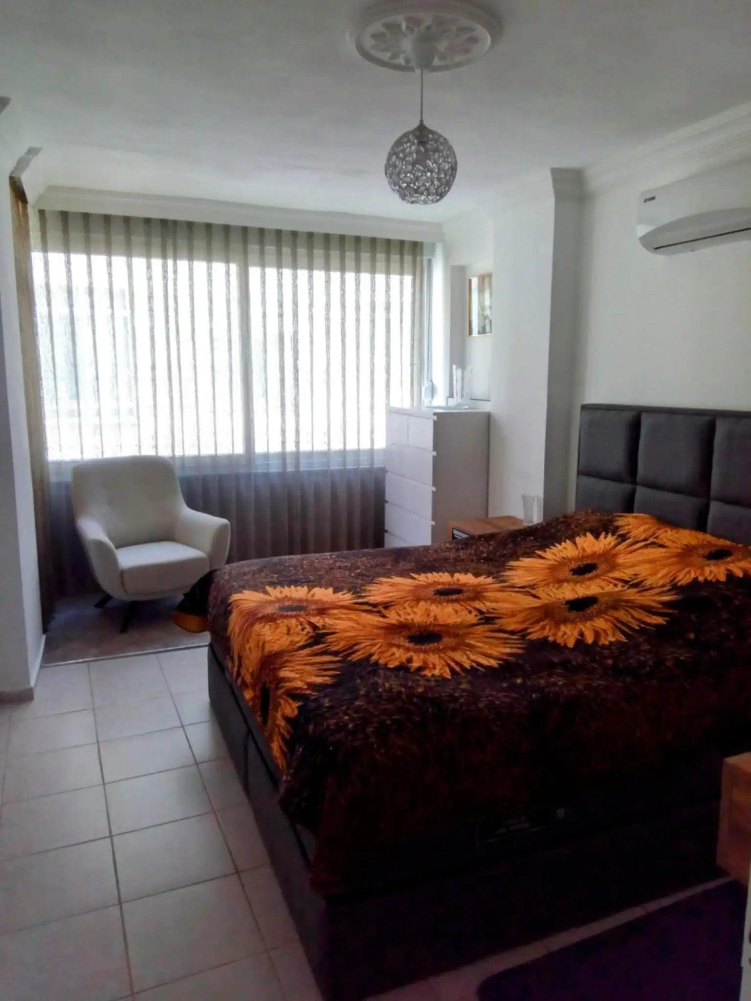 Внутри: Внутри квартиры вас ждут две уютные спальни и просторная гостиная, два полноценных санузла, три кондиционера для комфортного микроклимата в любое время года, а также большой застеклённый балкон — идеальное место для отдыха или домашнего сада. Жильё полностью укомплектовано всей необходимой мебелью и бытовой техникой, включая фильтр для питьевой воды. Горячая вода обеспечивается солнечными батареями, что позволяет значительно экономить на электричестве. Айдат составляет всего 200 лир в месяц — разумные расходы при высоком уровне комфорта.