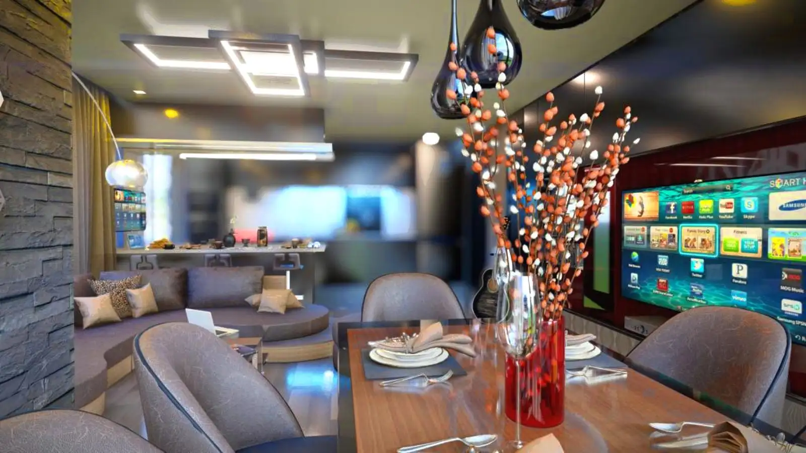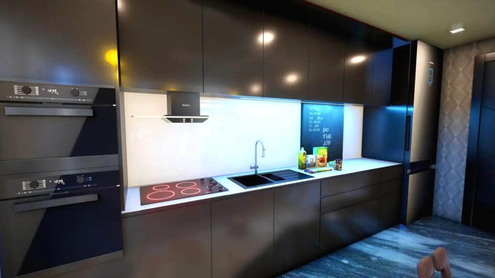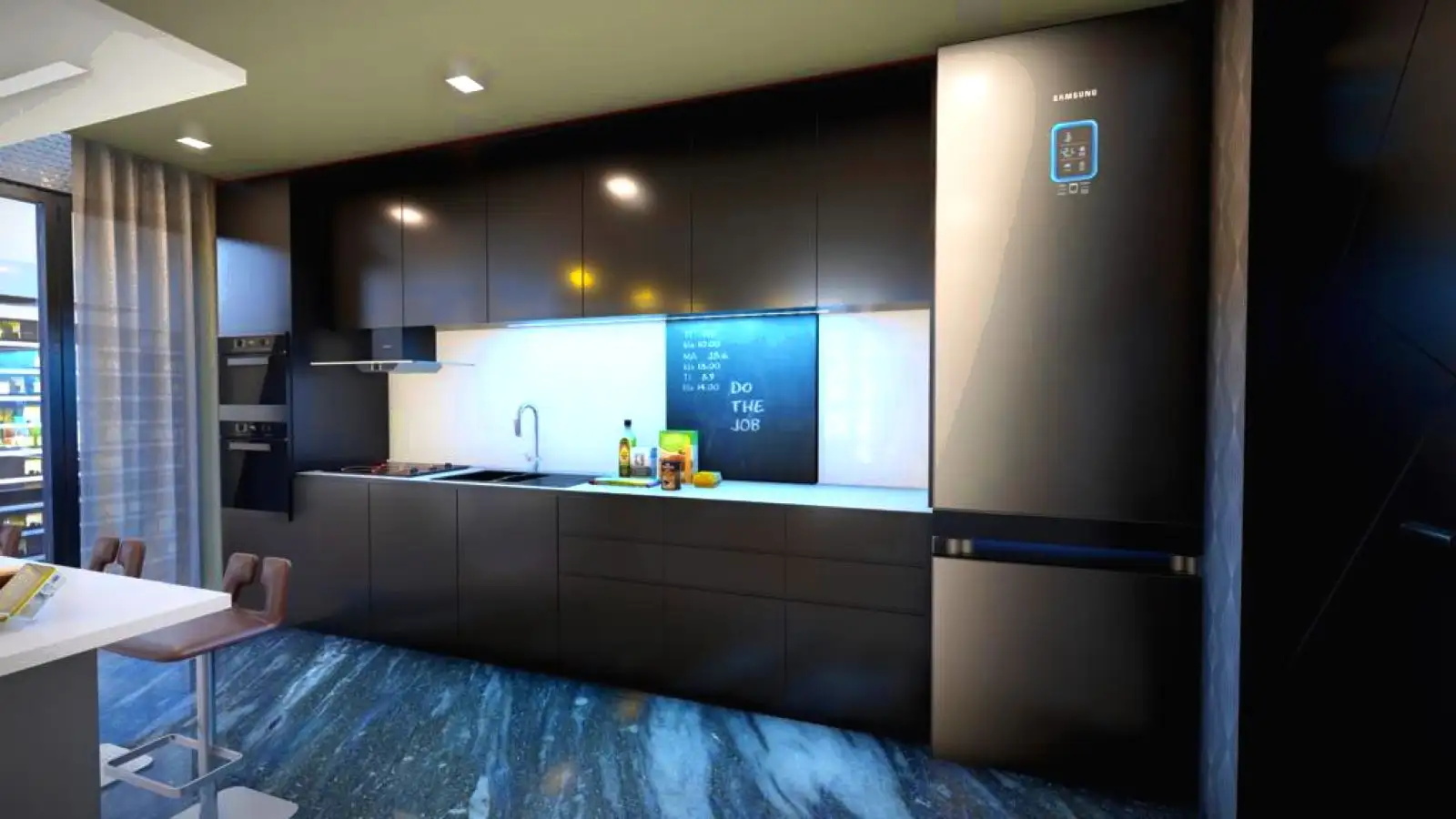 Кухня будет оборудована модульной мебелью и гранитной столешницей. В квартирах будет установлена система Умный дом, позволяющая управлять различным функционалом с помощью телефона.;