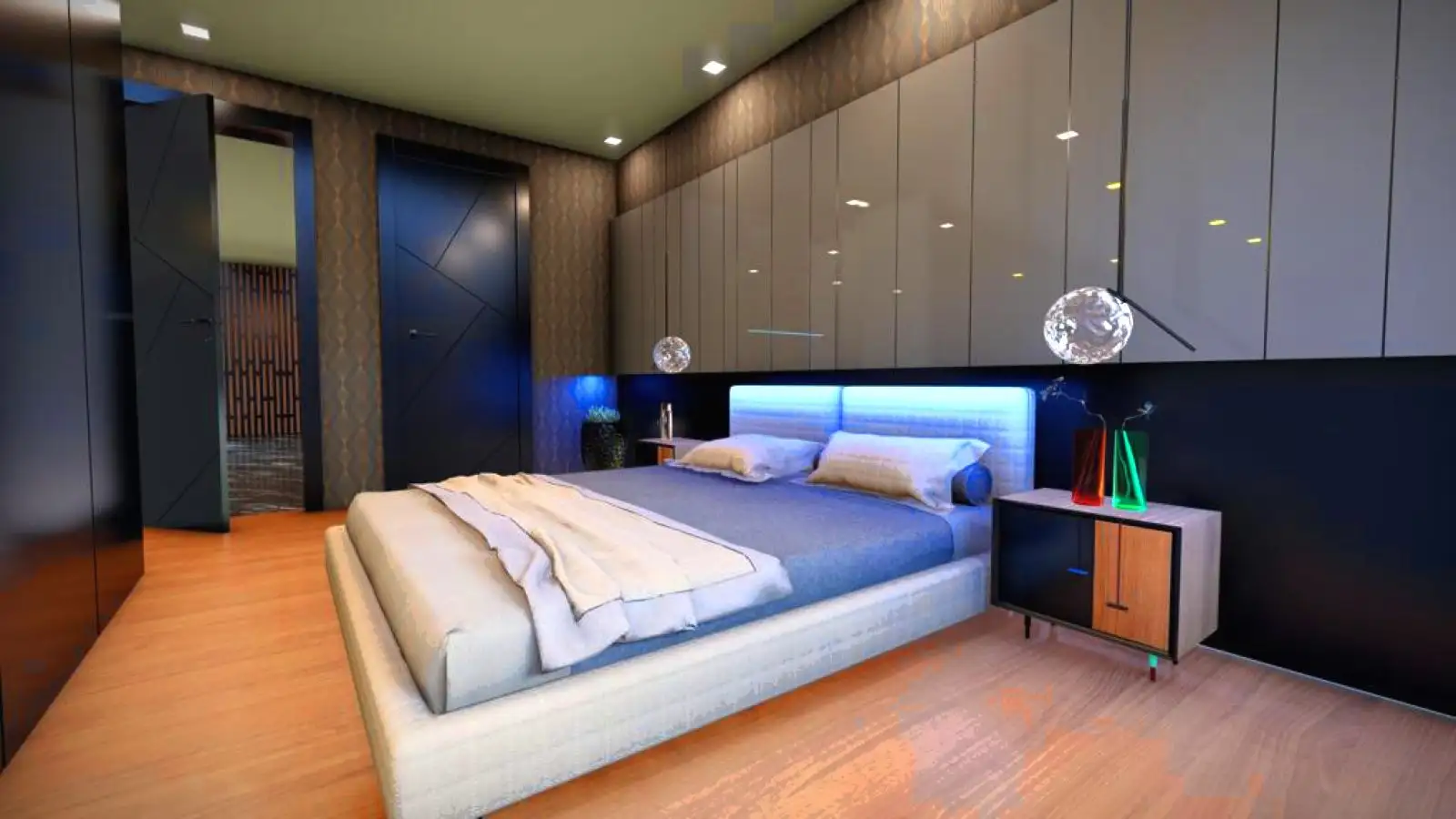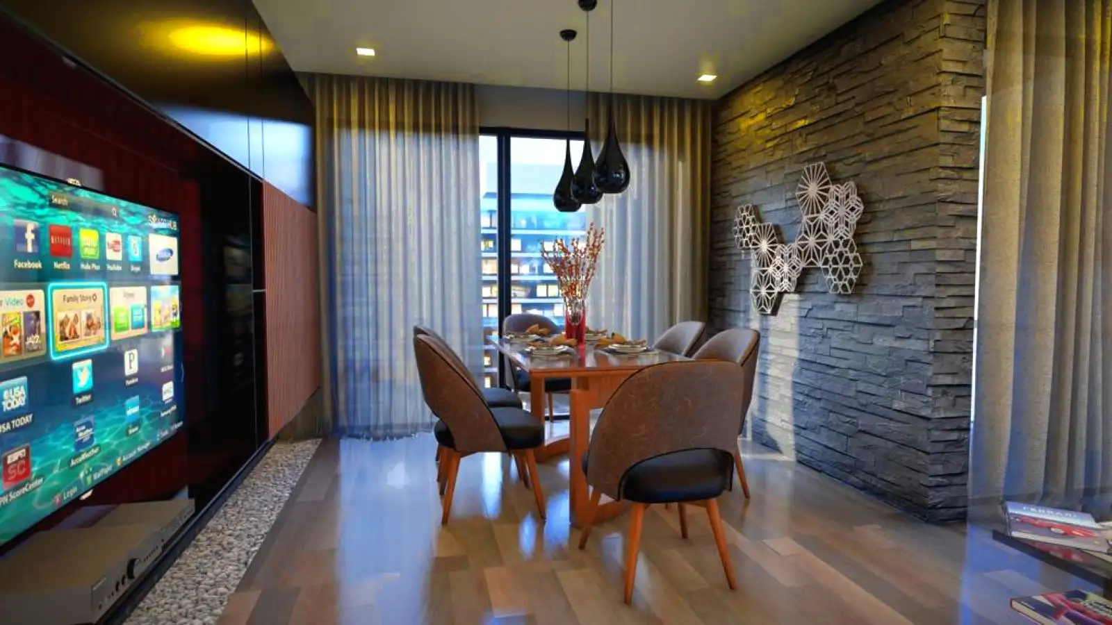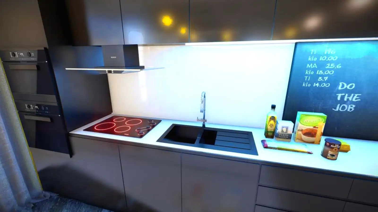 Кухня будет оборудована модульной мебелью и гранитной столешницей. В квартирах будет установлена система Умный дом, позволяющая управлять различным функционалом с помощью телефона.;
