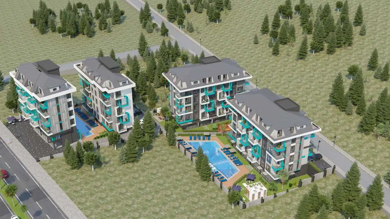 Что в комплексе: Проект строится на 1380 м2 и состоит из двух блоков. Территория комплекса украшена цветами и разнообразными растениями – апельсинами, оливками, кипарисами и пальмами. Разбит ландшафтный сад, где размещается детская площадка для игр и разнообразные беседки для отдыха на свежем воздухе. При въезде в комплекс находится открытая охраняемая парковка. В центре комплекса расположен бассейн.