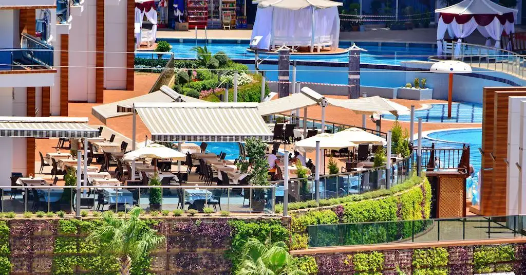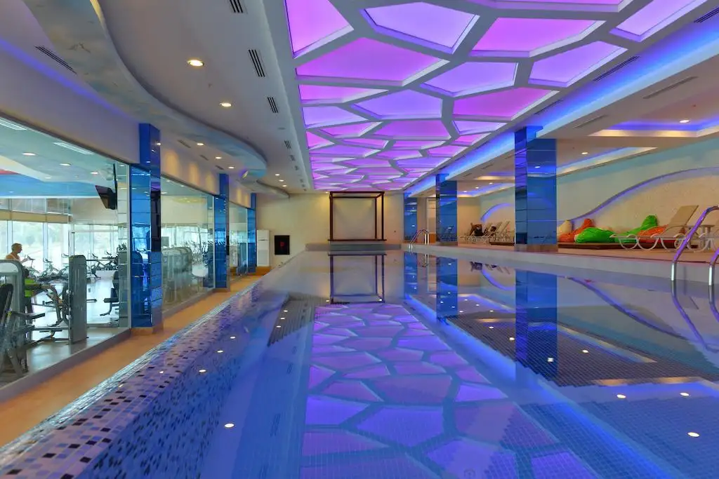 Крытая инфраструктура: крытый плавательный бассейн с подогревом, сауна, паровая комната, зона отдыха, массажные комнаты, турецкая баня (хамам), зал фитнеса, кинотеатр, дискотека, боулинг, развлекательный центр, игровая для детей, ресепшн, ресторан, магазин, лобби, кафетерий