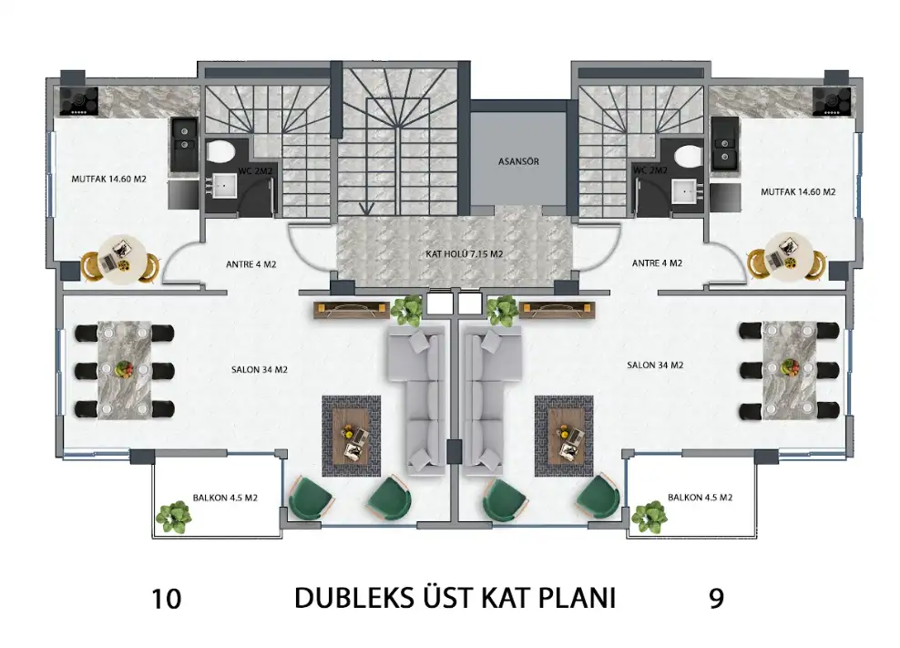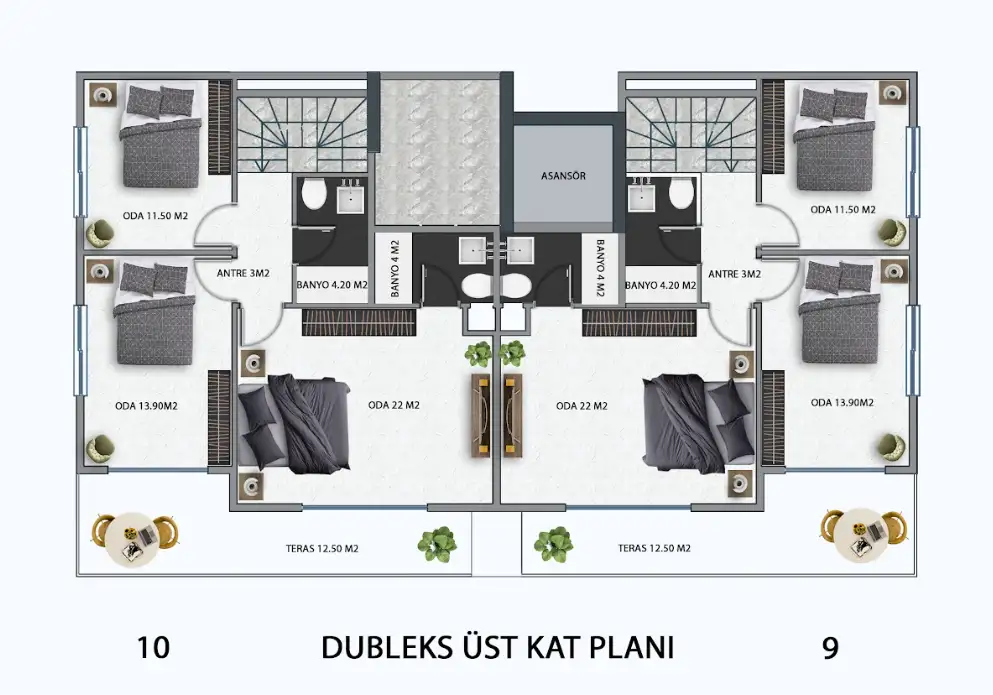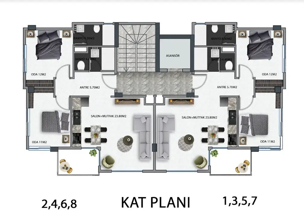 Внутри: На сегодняшний день актуальны квартиры планировок 2+1 и пентхаусы 2+1 и 3+1. Площадь квартиры варьируется от 90 до 180 квадратных метров. Все квартиры сданы в полной чистовой отделке - будут установлены современные стальные двери, стеклопакеты с дополнительной шумоизоляцией, красивые кухонные гарнитуры, будут полностью готовы ванные комнаты.