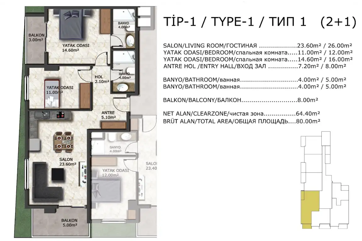 Внутри: Апартаменты предлагаются в традиционной чистовой отделке. Доступны планировки: