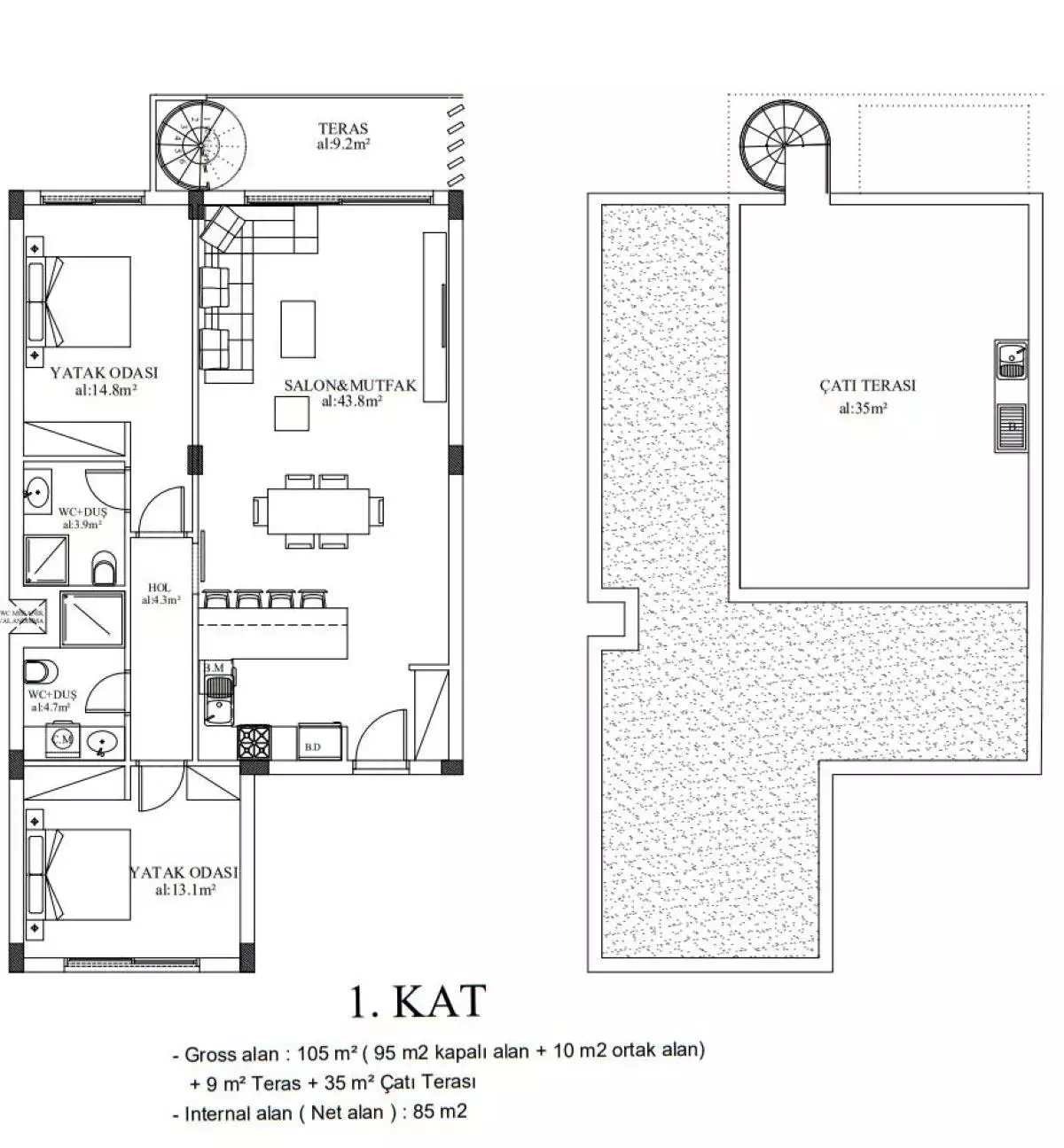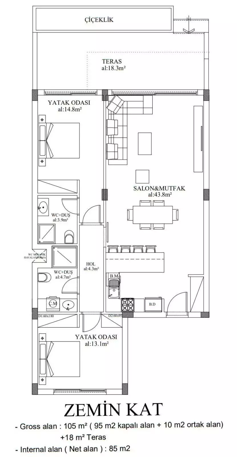 Апартаменты 2+1 площадью 105 с террасой 18 м2;