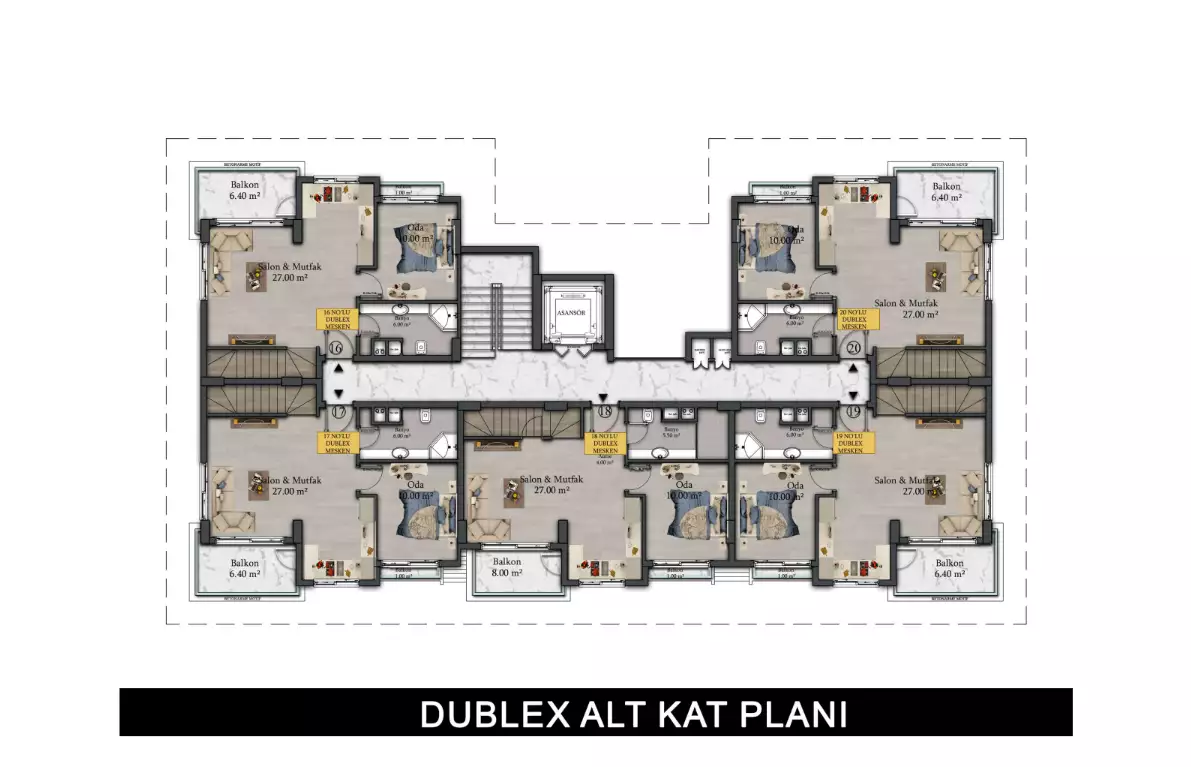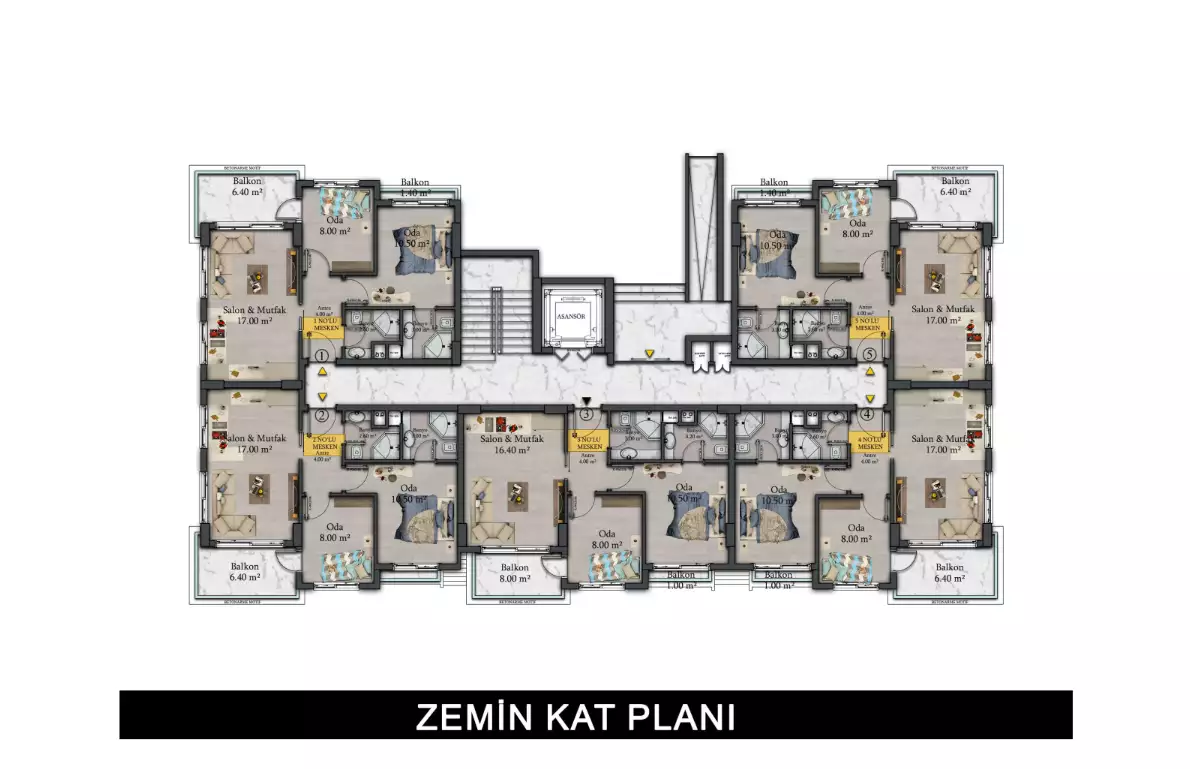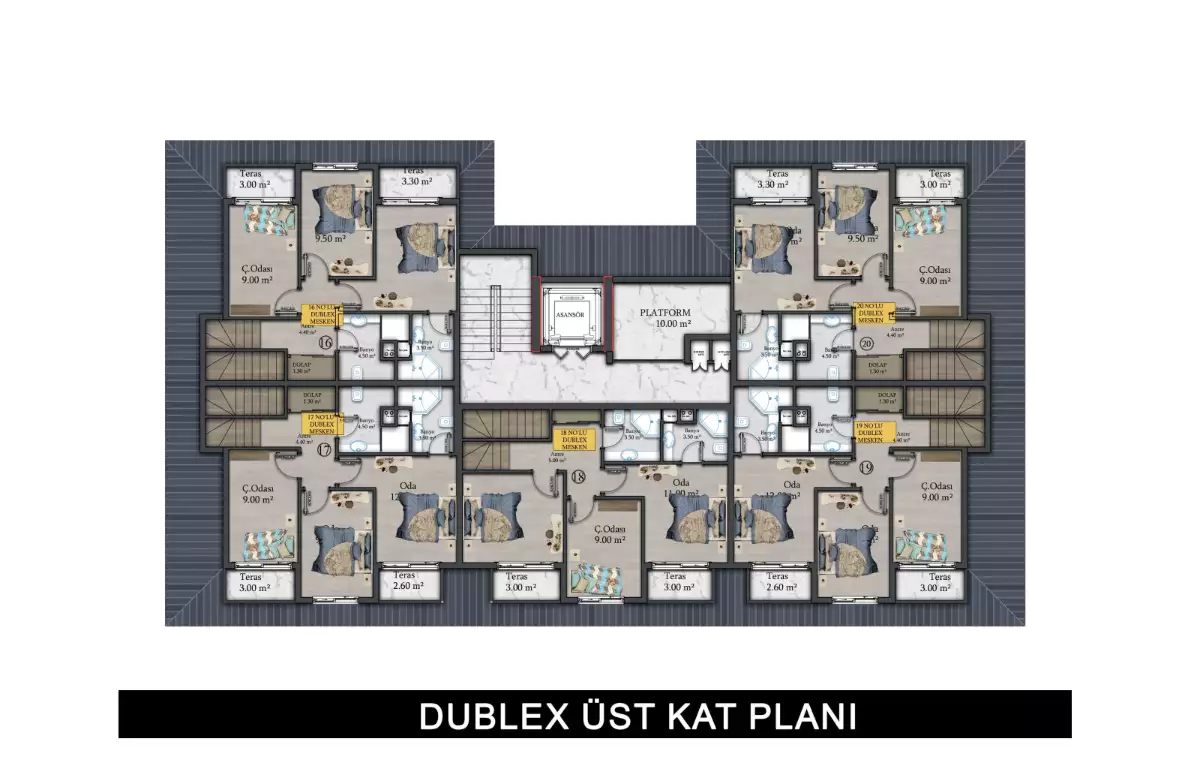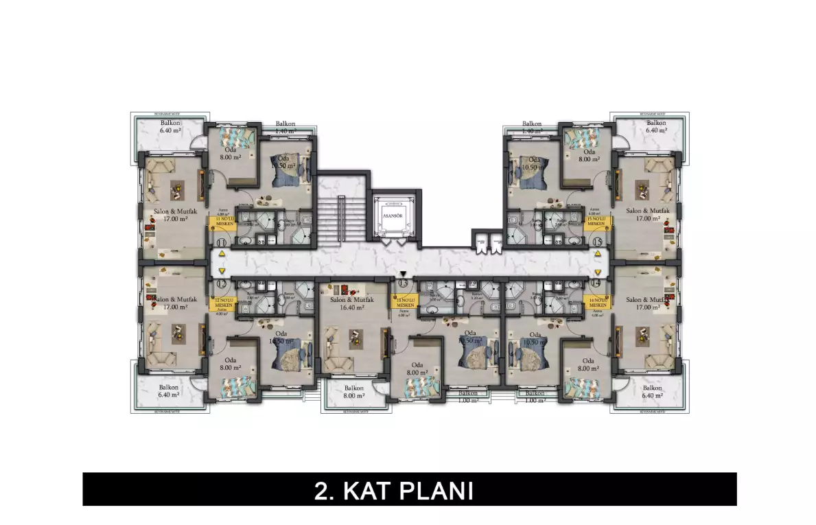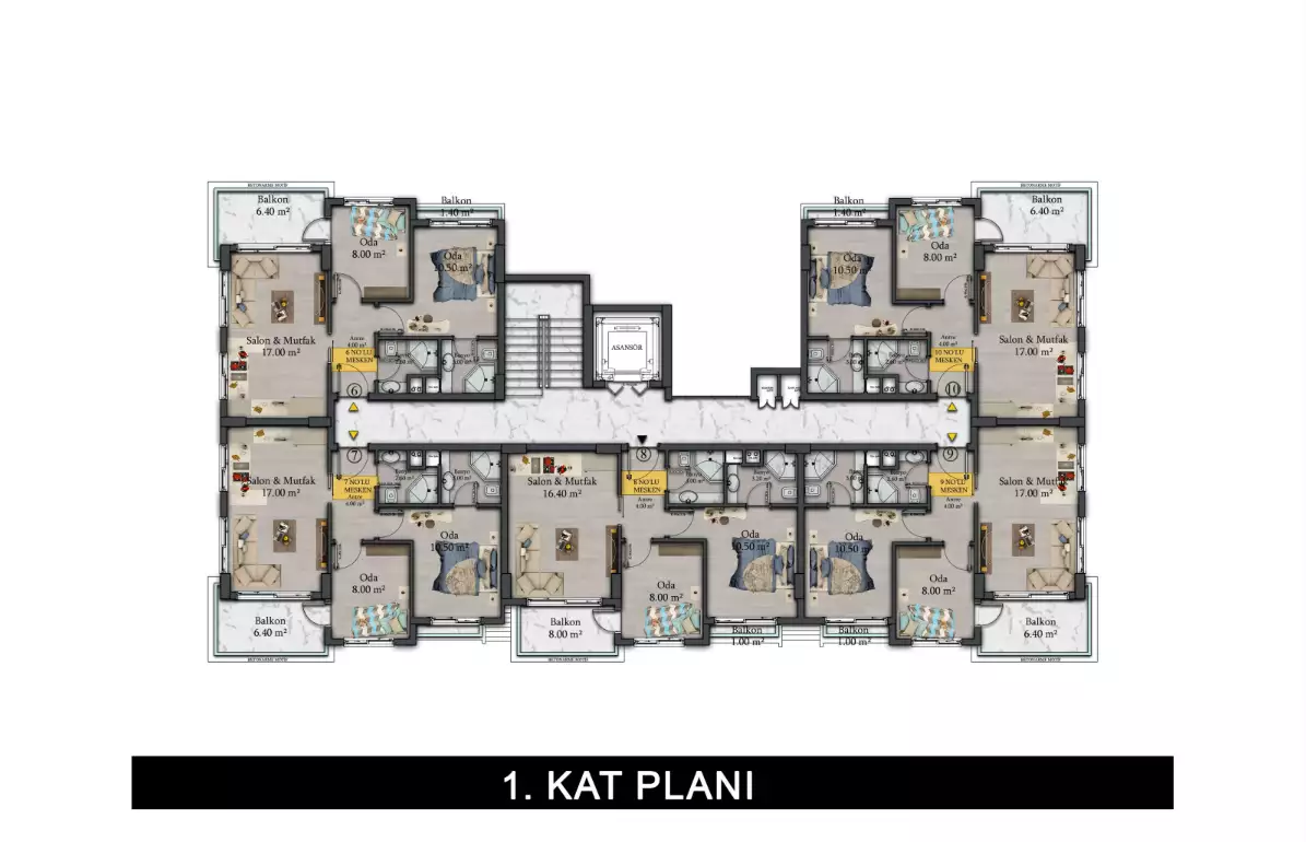 Внутри: В комплексе будут квартиры следующих планировок: 2+1 площадь 76 м2, 4+1 пентхаус площадь 150 м2.