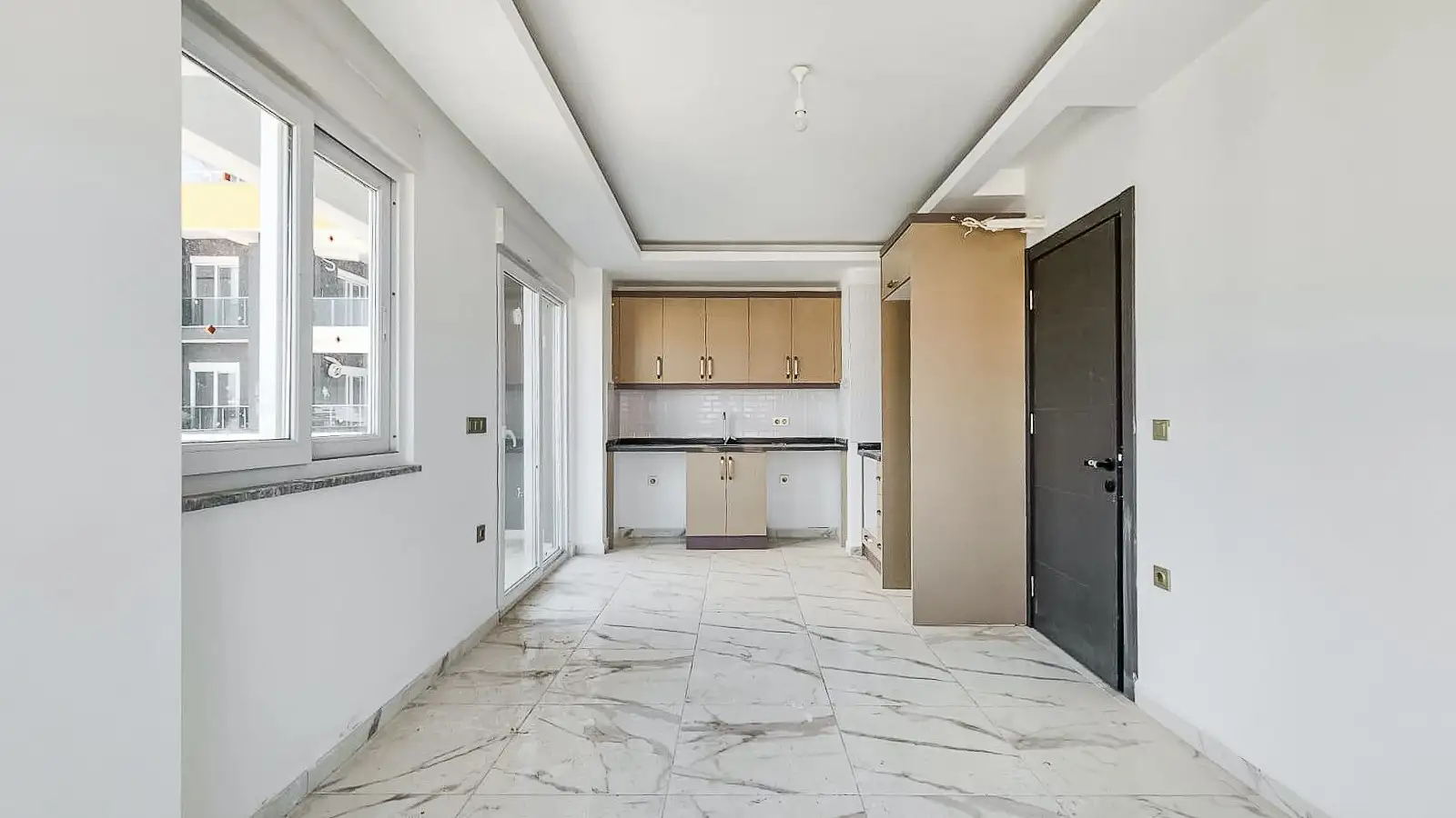 Внутри: Планировка 2+1 предполагает наличие 2 спальных комнат, гостиной с кухонной зоной, Квартира продаётся в чистовой отделке, укомплектована кухонным гарнитуром. С балкона открывается вид на горы и частичный вид на море.