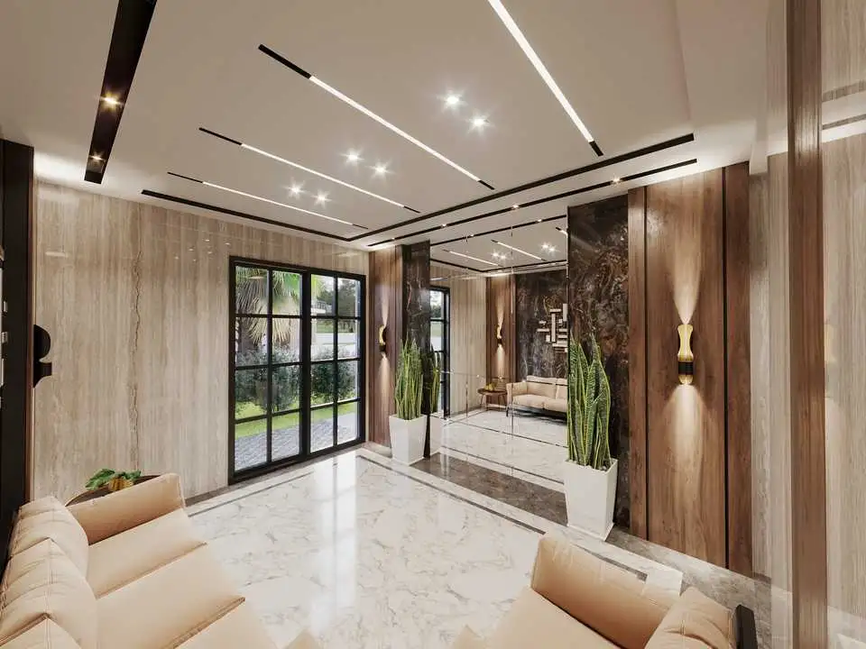 Внутри: В квартирах выполнен качественный ремонт, во всех комнатах керамическое покрытие, установлены подвесные потолки с точечной подсветкой, окна имеют двойное остекление, произведена звукоизоляция. Квартиры сдаются с полной чистовой отделкой, оборудованной ванной комнатой, на кухне установлен кухонный гарнитур и сантехника. В каждых апартаментах установлен ЖК-дисплей, обогреватель пола и электронагреватель для воды.