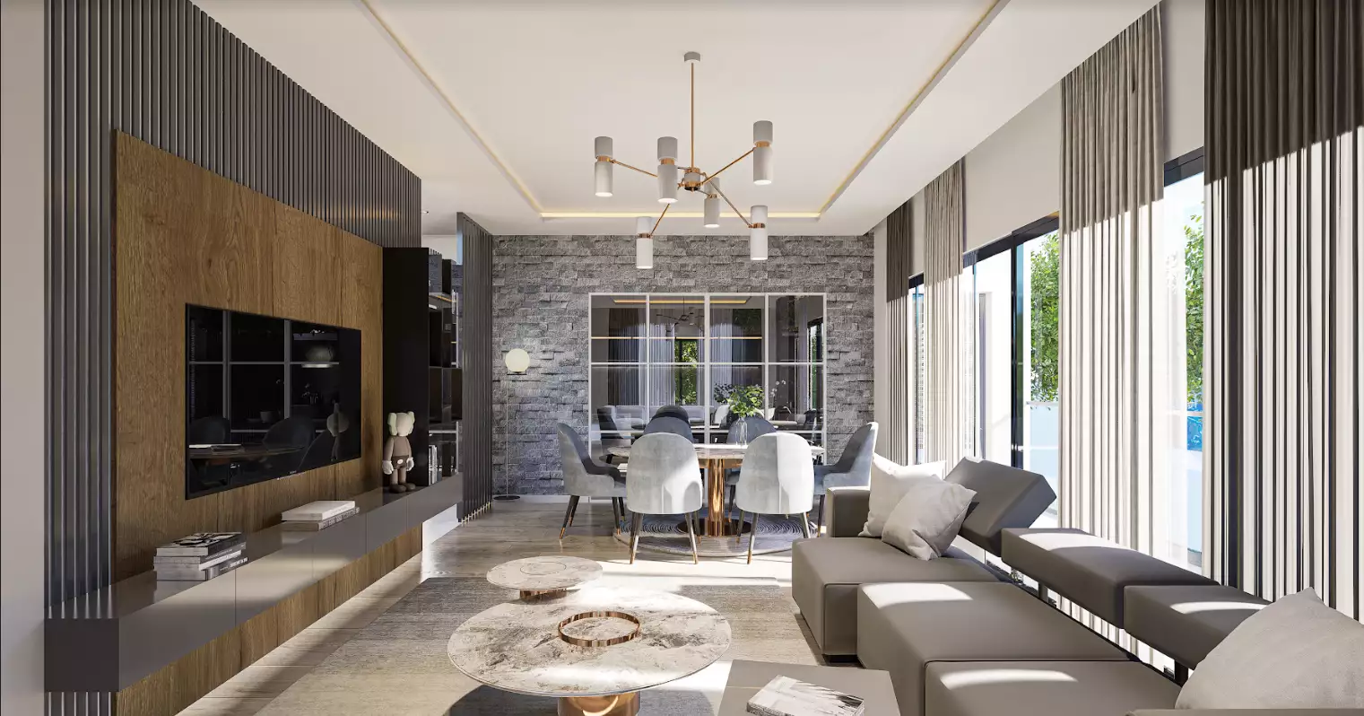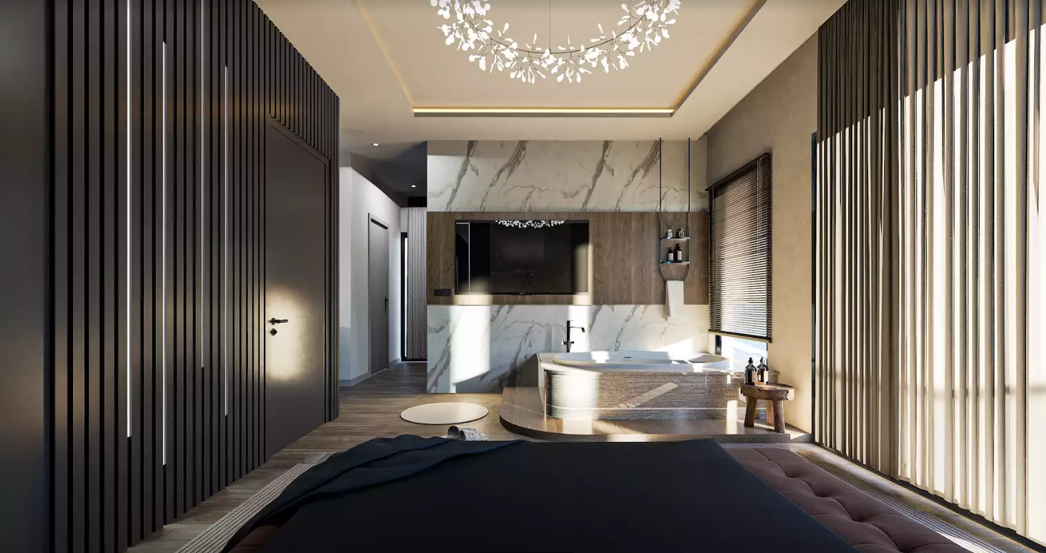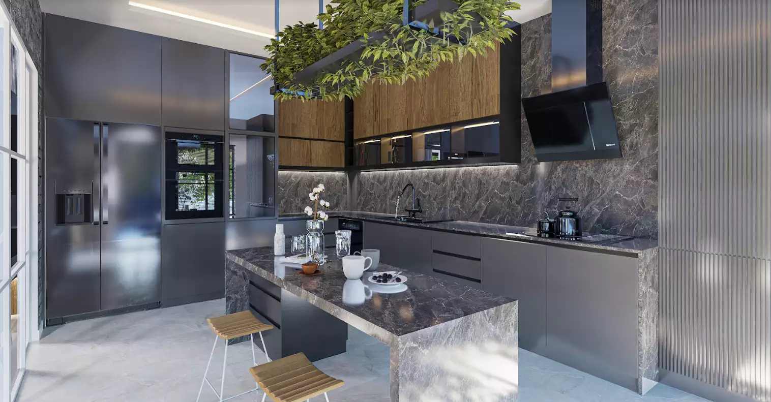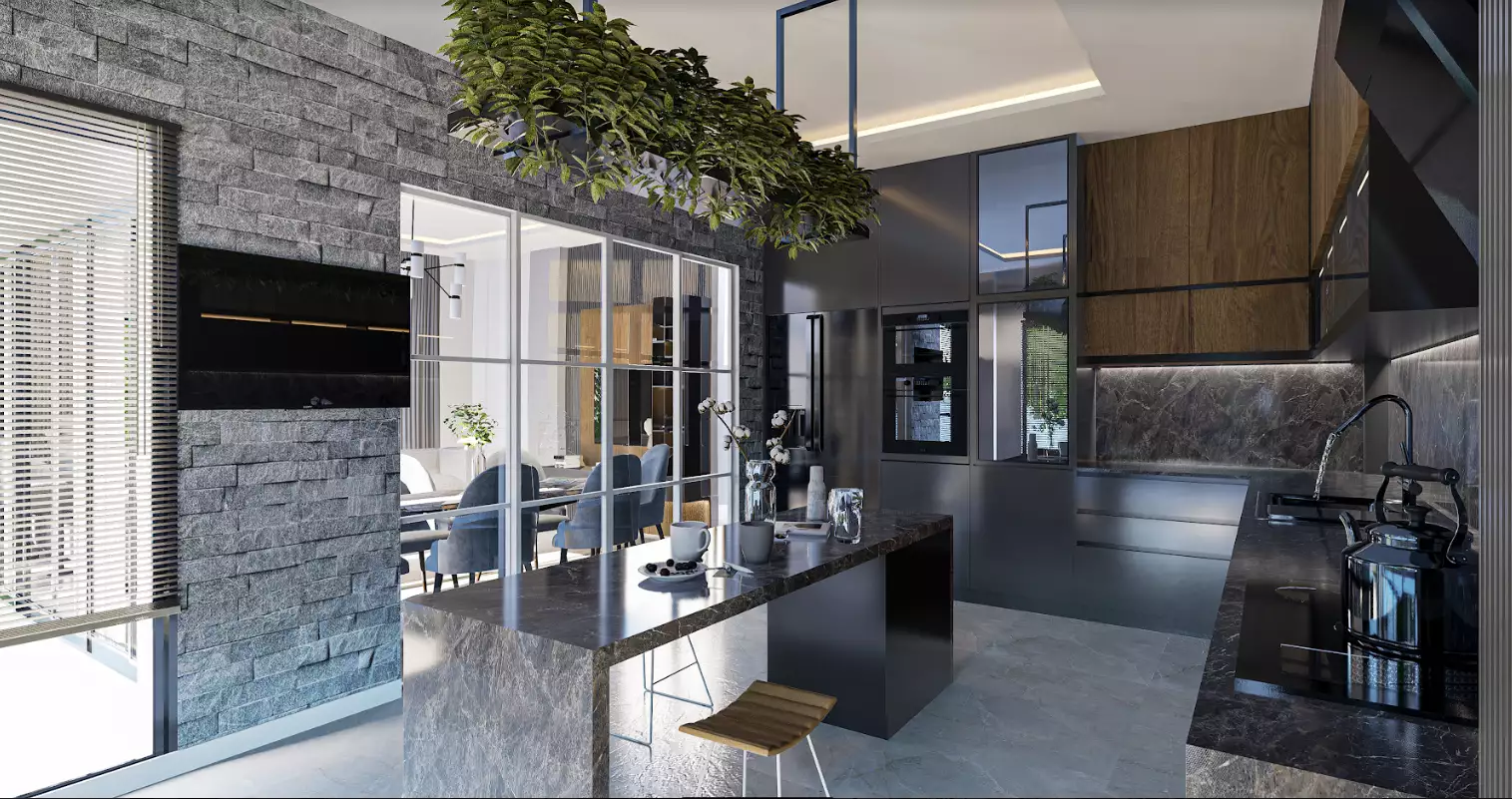 Внутри: Виллы предлагаются в стандартной чистовой отделке, с теплыми полами, островной кухней, оборудованными ванными комнатами и кухонной мебелью.