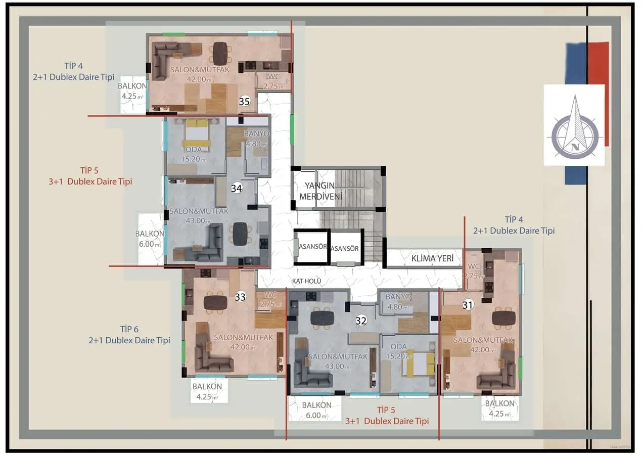 2+1 пентхаусы площадью 115 м2 и 120 м2;