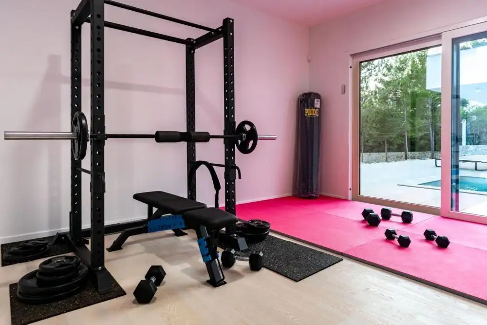 Оставшаяся часть здания представляет собой дополнительную комнату с тренажерным залом и выходом на террасу с бассейном, а за ней находится гараж на две машины, являющийся частью здания.