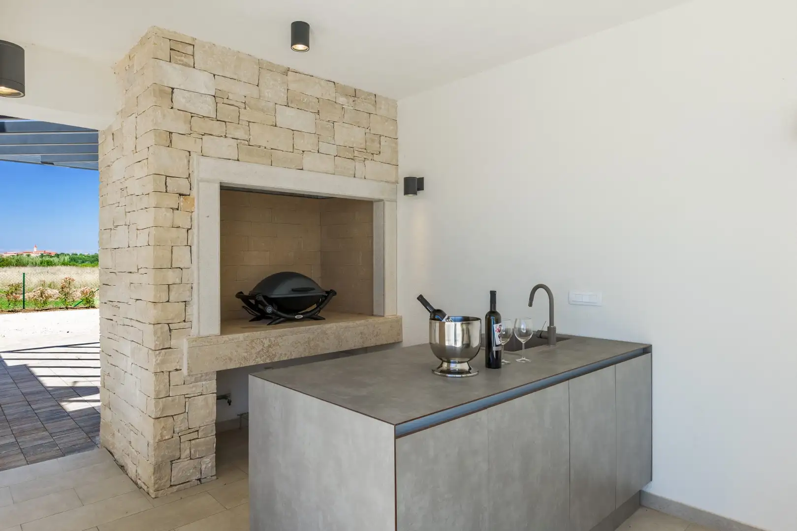 На открытом пространстве находится красиво оформленный сад площадью 480 м² с оливковыми деревьями, большим подогреваемым бассейном с солнечной террасой площадью 40 м², джакузи, просторными зонами для загара и отдыха, а также крытой летней кухней с барбекю. Полностью огороженный участок гарантирует полное уединение и идеально подходит для отдыха на свежем воздухе, социальных встреч и наслаждения истрийским климатом.